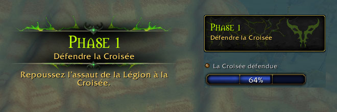 Lorsque vous êtes sur l'un des sites d'invasion en Azeroth (Royaumes de l'est ou Kalimdor) comme à Tanaris, Tarides du Nord, Marche de l'ouest, Contreforts de Hautebrande, Mulgore, Azshara et Dun Morogh, un scénario en plein air de 4 phases débute ainsi dans l'une des zones aux quatre coins du monde avec une première phase à défendre un espace frappé par la Légion ardente via un vaisseau indiqué par un cristal gangrené dont les attaques vont s'intensifier jusqu'à la sortie de l'extension.