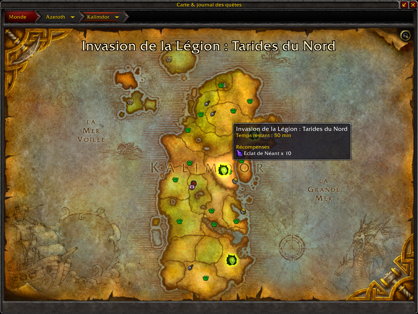 Lorsque vous êtes sur l'un des sites d'invasion en Azeroth (Royaumes de l'est ou Kalimdor) comme à Tanaris, Tarides du Nord, Marche de l'ouest, Contreforts de Hautebrande, Mulgore, Azshara et Dun Morogh, un scénario en plein air de 4 phases débute ainsi dans l'une des zones aux quatre coins du monde avec une première phase à défendre un espace frappé par la Légion ardente via un vaisseau indiqué par un cristal gangrené dont les attaques vont s'intensifier jusqu'à la sortie de l'extension.