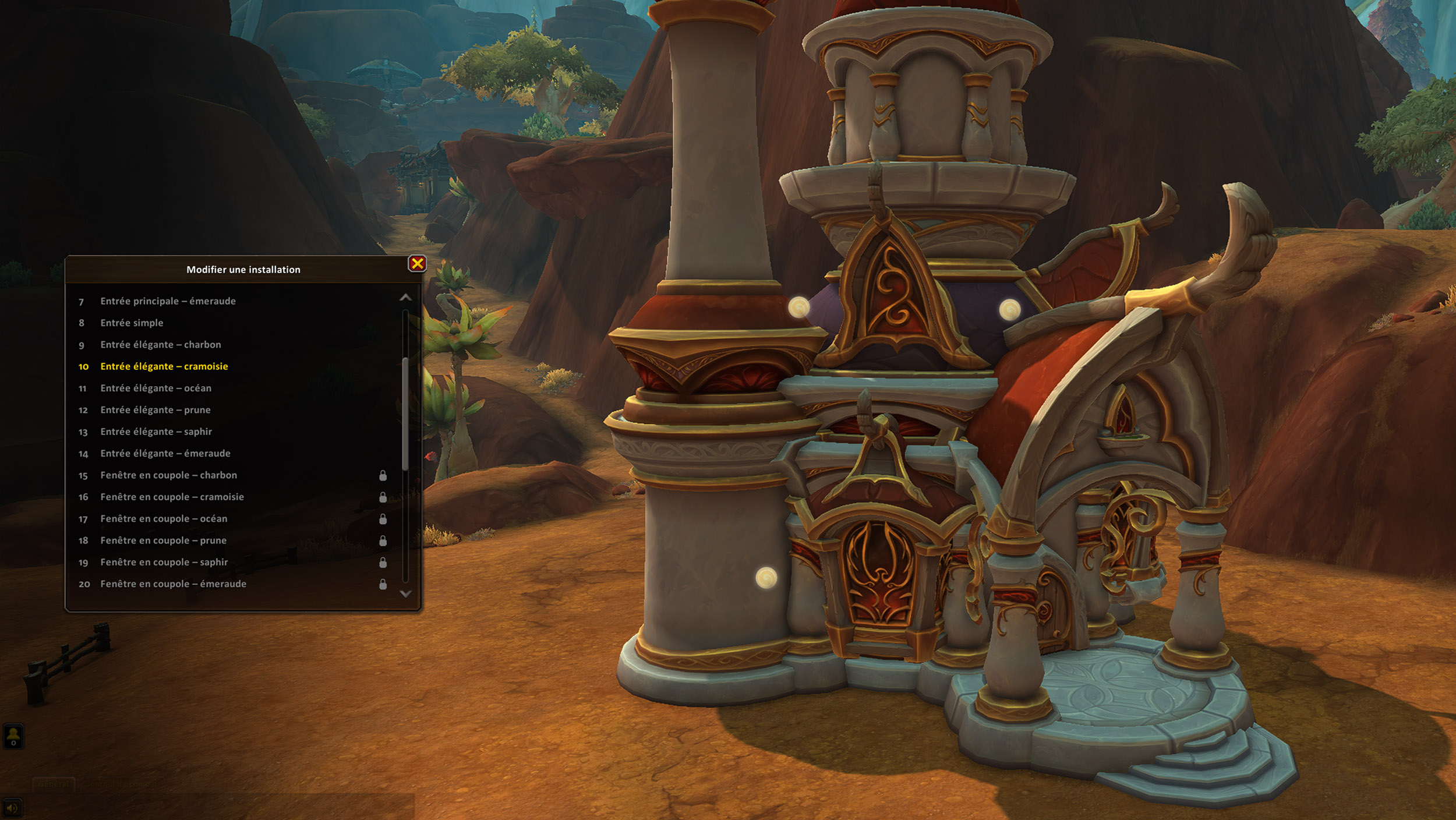 Elfe de sang : les installations de la Horde sont déclinés en 6 couleurs (charbon, cramoisie, océan, prune, saphir et émeraude).