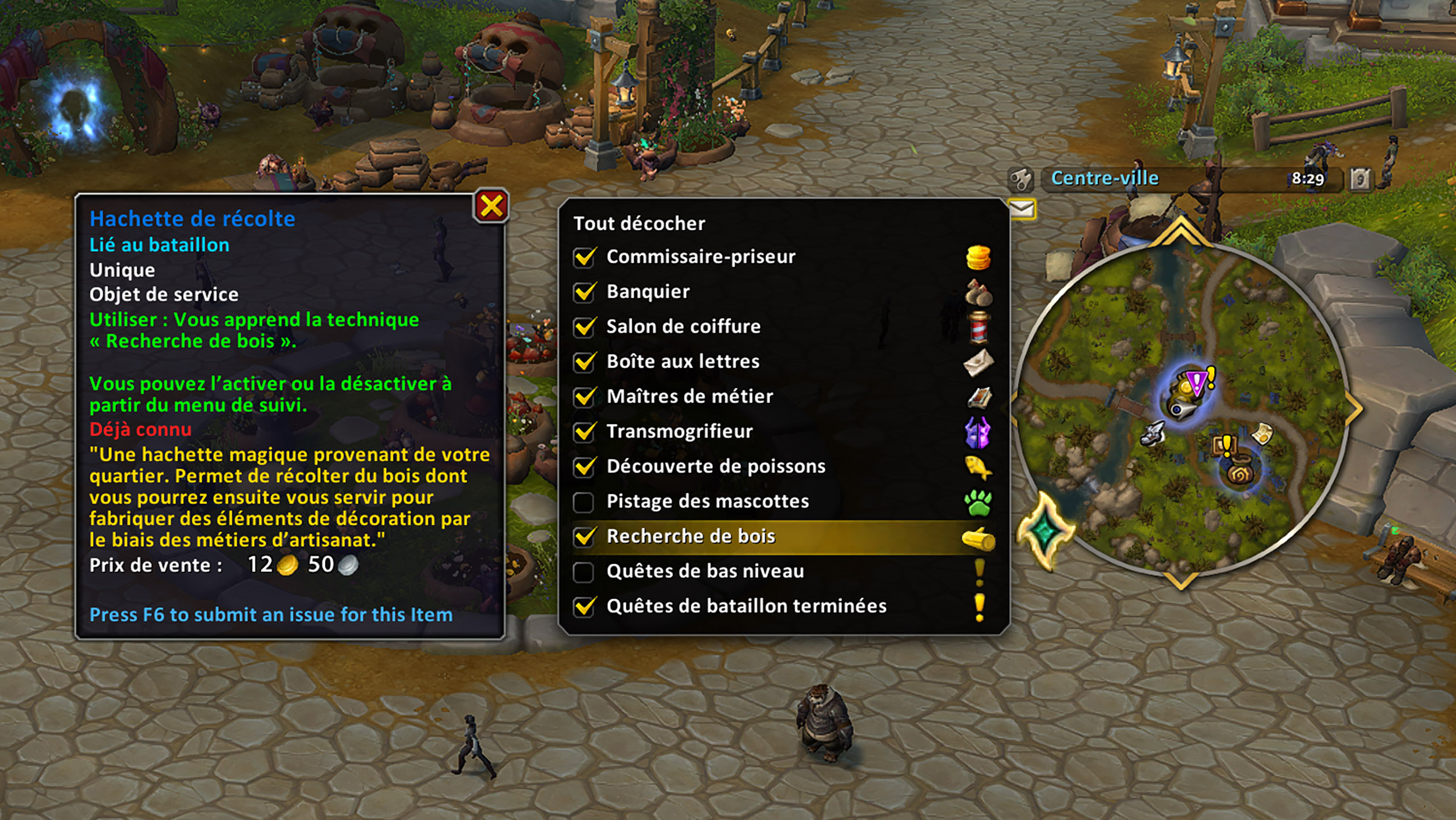Hachette de récolte vous apprend la nouvelle technique « Recherche de bois » pour l'activer ou la désactiver à partir du menu de suivi. Cet objet de service est consommé à l'utilisation depuis l'inventaire pour débuter la récolte de bois en Azeroth et au-delà sur le compte avec cette nouvelle option de suivi sur la mini-carte.