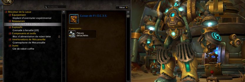 La nouvelle zone à Mécagone dans la mise à jour 8.2 permet de participer aux nombreuses activités proposées pour obtenir un nouveau type de ressource : bricolage de Mécagone. Ces ressources spéciales sont particulièrement utiles pour collaborer avec des personnages-joueurs sur des projets de construction, mais également de pouvoir fabriquer plusieurs objets utiles au bricoleur de la casse. Ce robot géant à Mécarouille possède une base de données étendue par les plans récupérés à travers plusieurs méthodes d'obtention. Vous pouvez retrouver toutes les informations concernant le bricoleur de la casse avec le mode d'obtention de ses 38 plans, ainsi que l'aperçu de ces objets fabriqués.