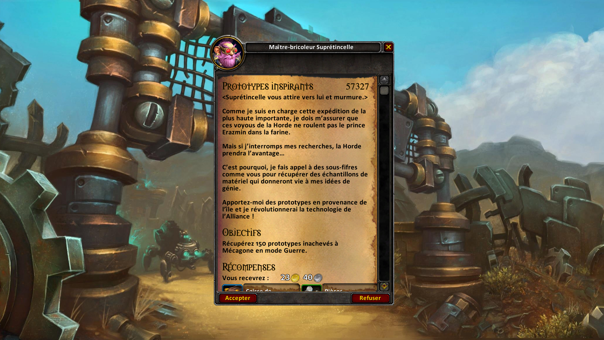 Blizzard a appliqué un correctif en jeu pour aider les joueurs à progresser plus rapidement dans la réputation à la résistance de Mécarouille avec une nouvelle quête journalière accessible à Mécagone par le mode guerre uniquement. Cette quête est proposée par le Maître-bricoleur suprétincelle (Alliance) et Gazleu (Horde) à proximité du prince Ezazmin pour participer à diverses activités sur l'île (créatures rares, coffres ou éliminer la faction adverse). Une fois que les 150 prototypes sont récupérés, vous obtenez des points de réputation à la résistance de Mécarouille ainsi que des pièces détachées, avec un bonus supplémentaire pour l'Alliance puisqu'elle est en sous-nombre pour le mode guerre. Vous pouvez retrouver toutes les informations de cette nouvelle quête journalière pour débloquer la deuxième partie du vol de Battle for Azeroth plus rapidement.
