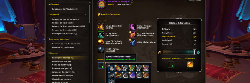 Les couturiers (tissus) et les travailleurs du cuir (mailles et cuir) ont une nouvelle recette pour créer un ensemble avec un bonus de 2-pièces entre les 3 pièces d'équipement différentes. Cet ensemble consomme 2 embellissements simultanément pour appliquer le bonus sur le personnage.