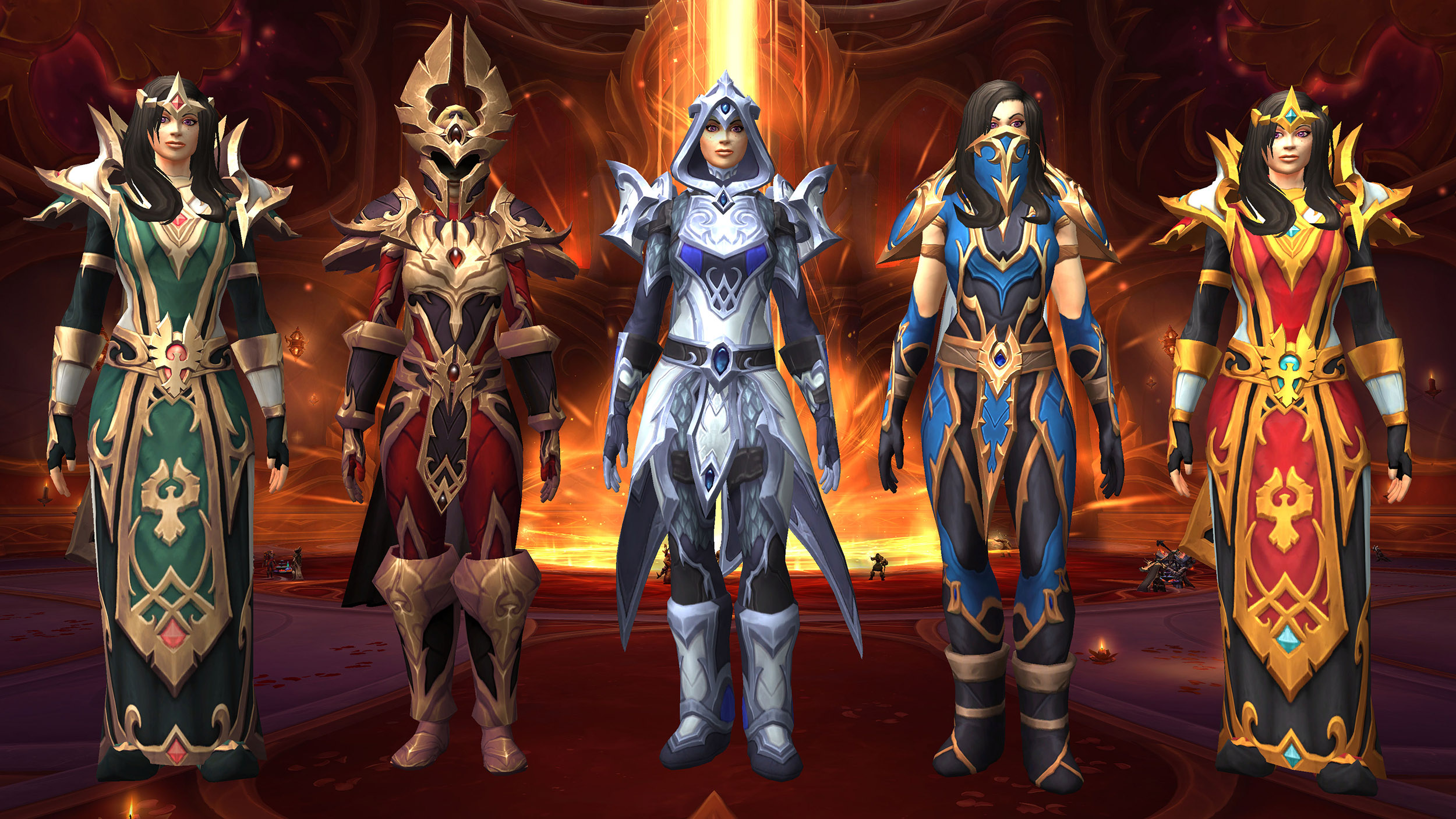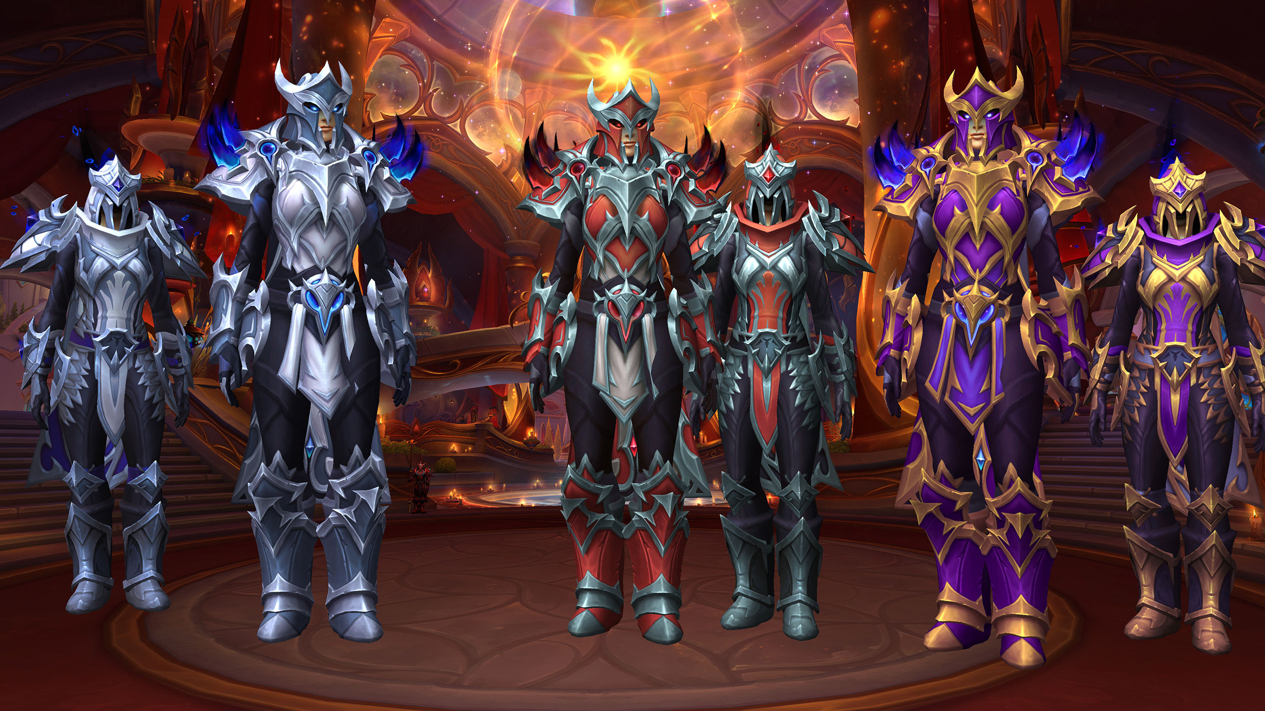 13 ensembles d'armure de classe avec six variations. Cet ensemble s'obtient par le contenu de la saison 1 de Midnight : boss de raid (Flèche du Vide, Faille du Rêve et Marche sur Quel'Danas), catalyseur et grande chambre-forte.