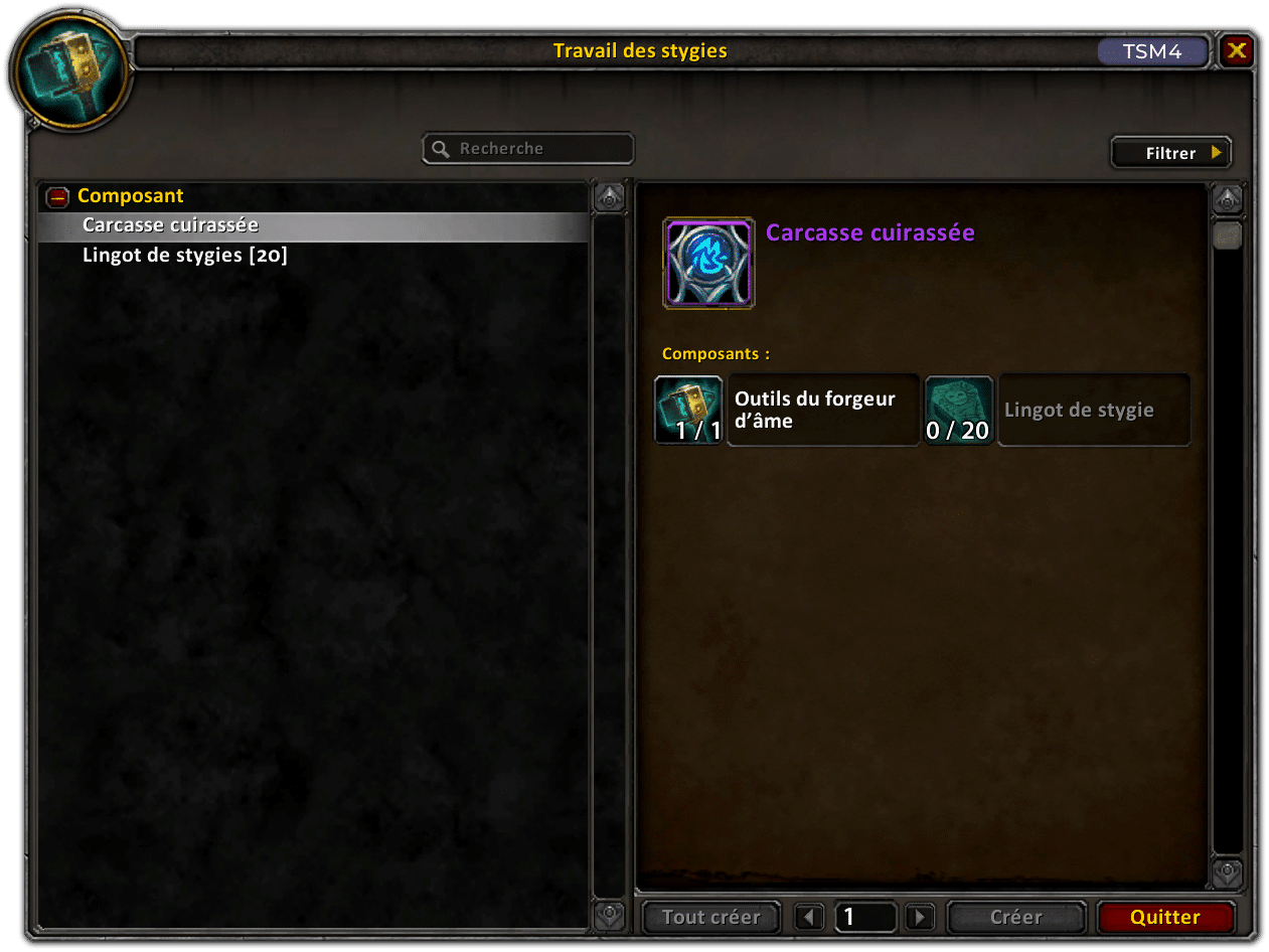 Bonjour à tous! j’ai farmé les éclisses de stygies et les poussières(2×200) j’ai l’âme du loup, le stèle délabré..