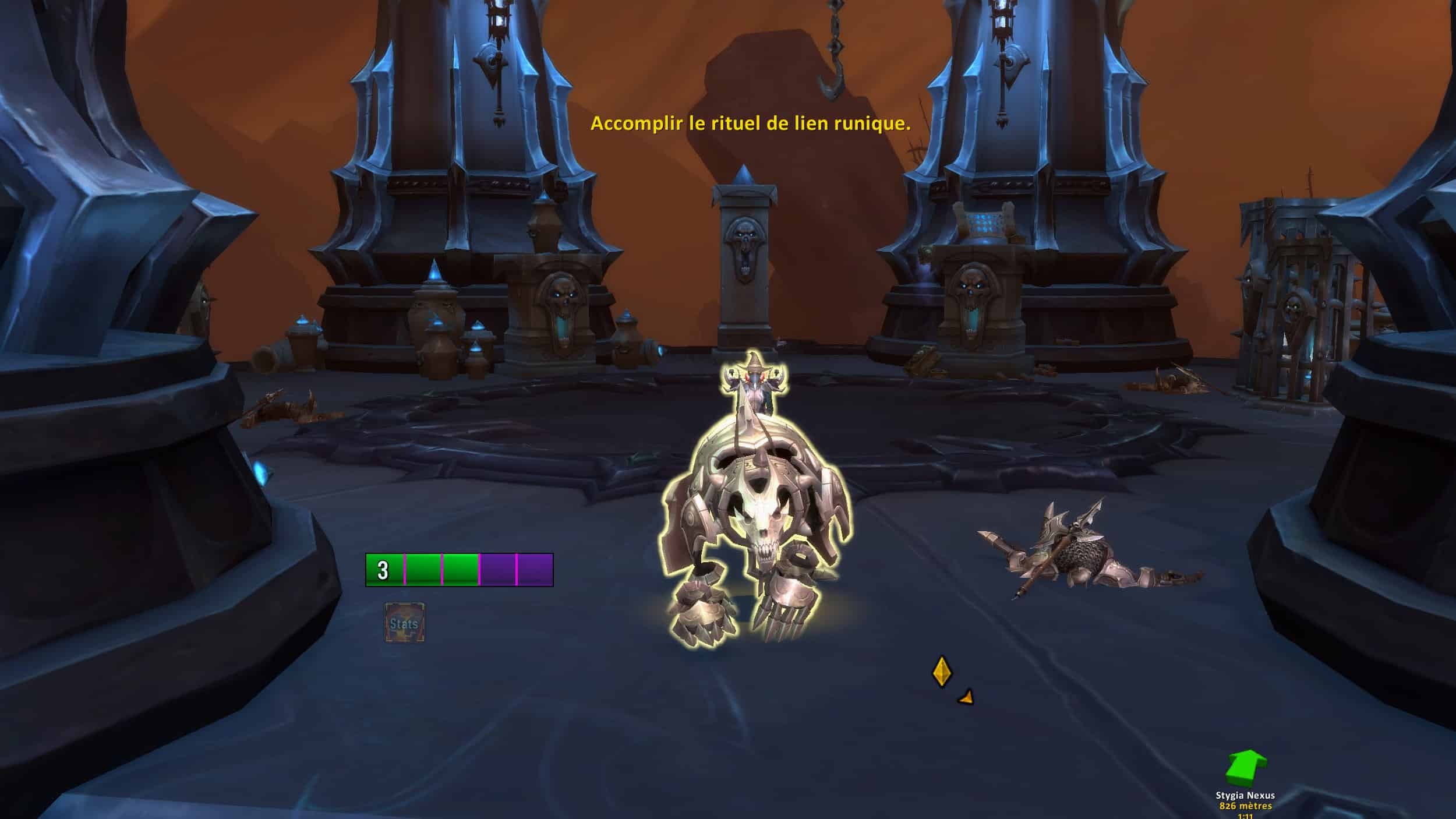 Au fur et à mesure des mises à jour de contenu de Shadowlands, l'Antre est une zone de niveau maximum qui évoluera par plusieurs nouveautés prévues : travail des stygies, nouveaux objets et la prochaine résurgence de Korthia, la ville des secrets. Avant de découvrir le nouveau secteur de l'Antre avec Korthia, la mise à jour 9.0.5 propose un mini-secret pour exécuter un puissant rituel runique qui vous lie à la nouvelle monture terrestre par le travail des stygies :