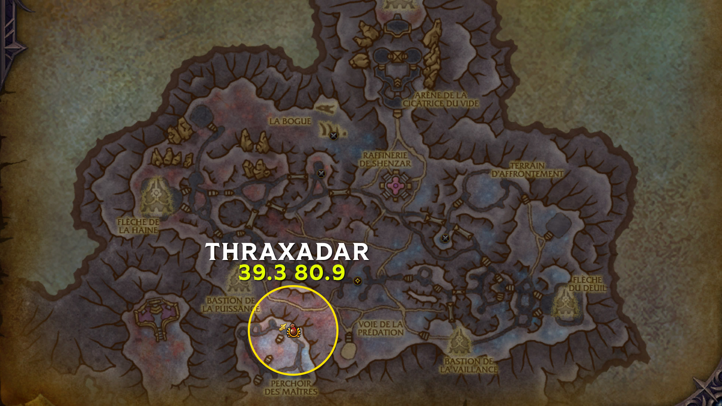 Le griffentaille frénétique est disponible par la progression de la nouvelle réputation JcJ de la zone en extérieur à la tempête du Vide. La réputation du Duellum meurtrier progresse par les expéditions, les combats et les quêtes sur le champ de bataille de la colline Meurtrière. Une fois que vous avez atteint le rang Exalté sur le personnage, vous pouvez interagir avec Thraxadar au Perchoir des maîtres (