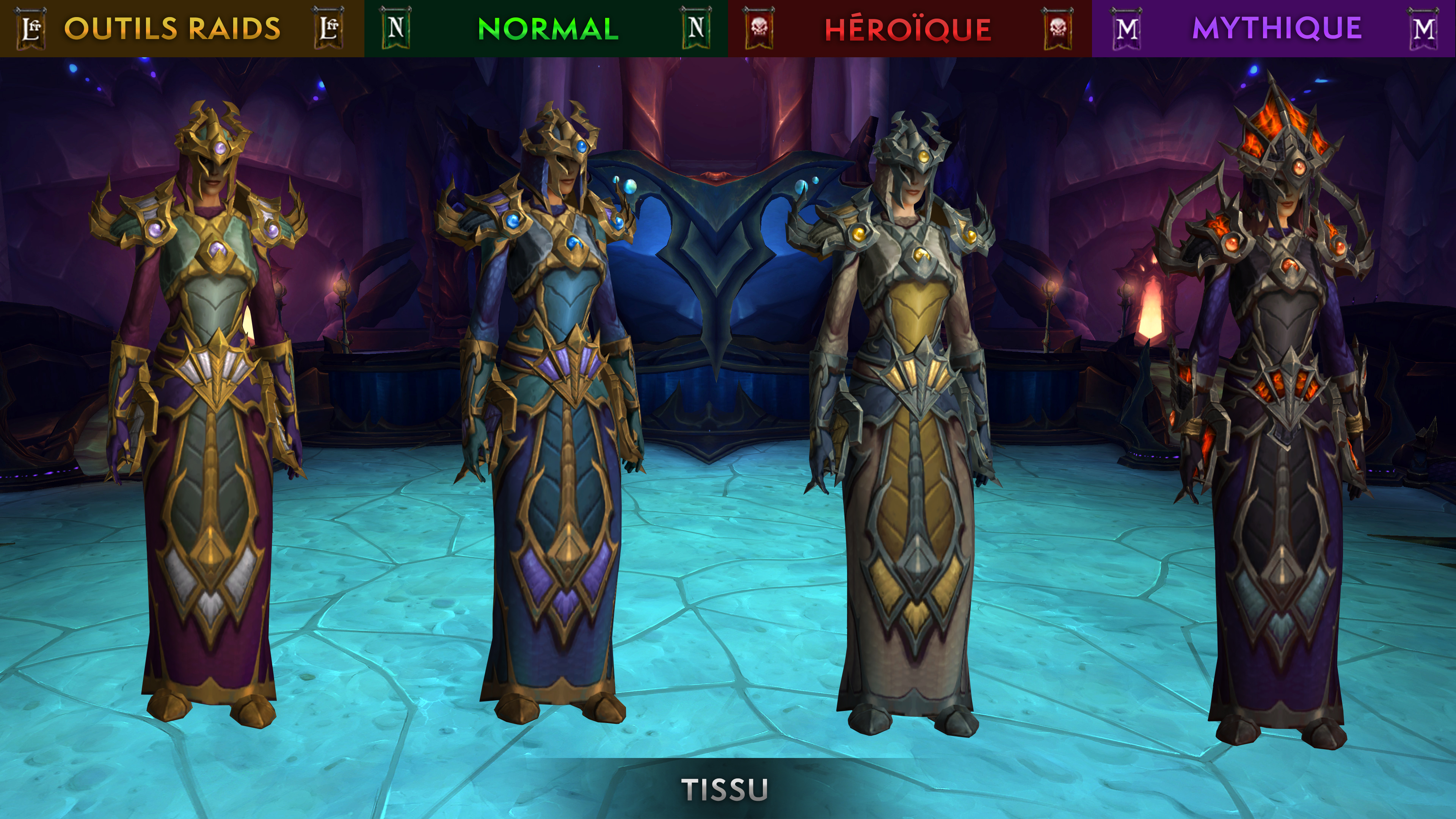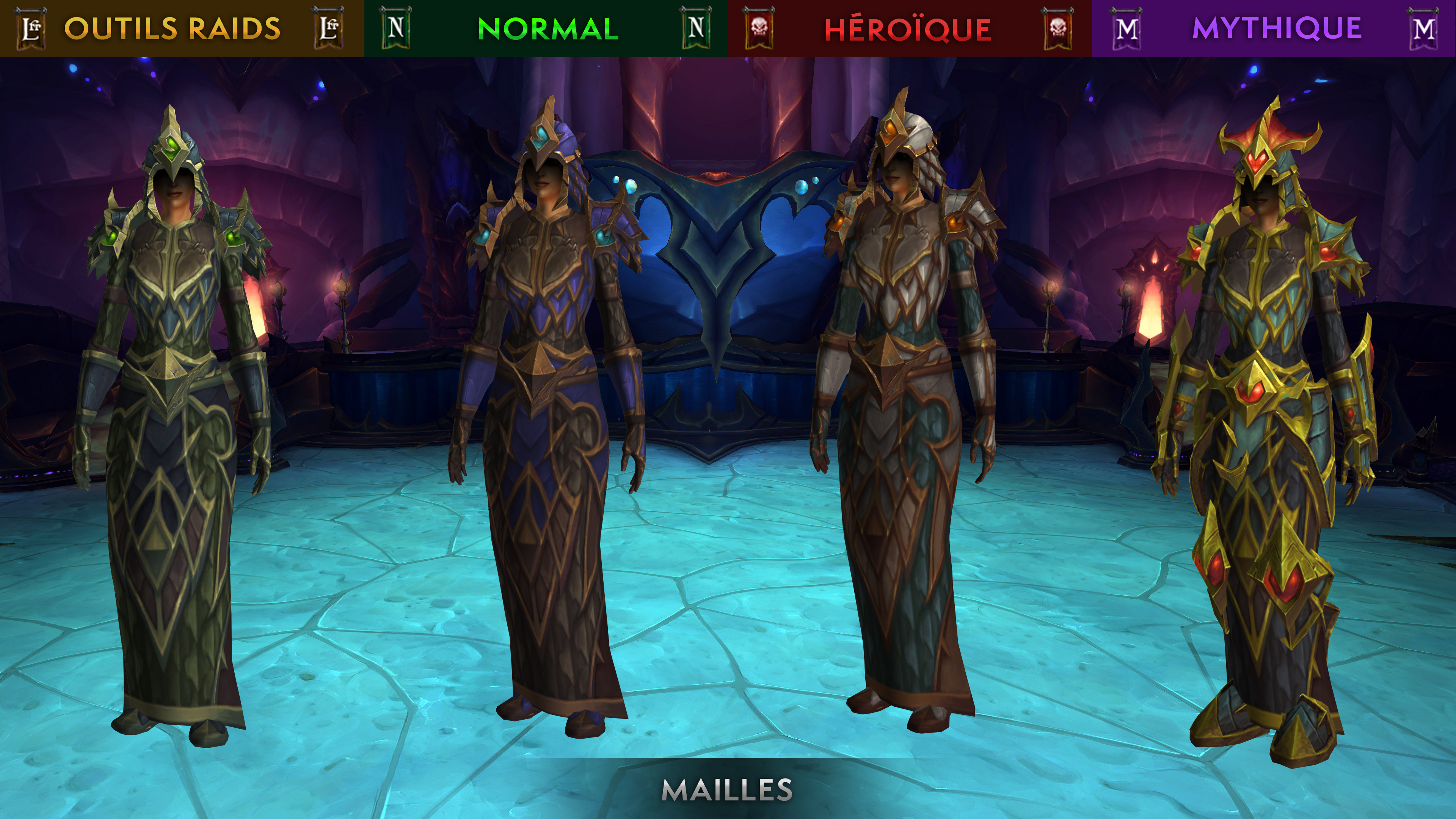 Le palais Éternel est le raid principal de la mise à jour 8.2 de Battle for Azeroth. Ce nouveau palier de raid permet d'obtenir un ensemble d'armure cosmétique de chaque type d'armure décliné en plusieurs coloris différents selon le mode de difficulté. Hormis les caractéristiques conférées, ces ensembles d'armure sont thématiques avec l'environnement et l'histoire du nouveau raid avec la reine Azshara & les profondeurs de Nazjatar. Vous pouvez découvrir l'aperçu de ces nouveaux set d'armure avec les variations de coloris pour chaque type.