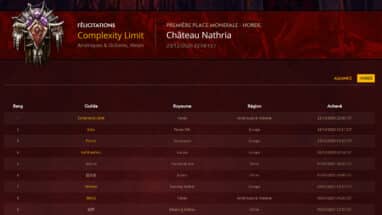 Depuis l'ouverture du château Nathria en mode mythique, le mercredi 16 décembre en Europe, la guilde « Complexity Limit » dans la Horde a décroché la première place mondiale le mercredi 23 décembre, au bout de 7 jours de compétition.