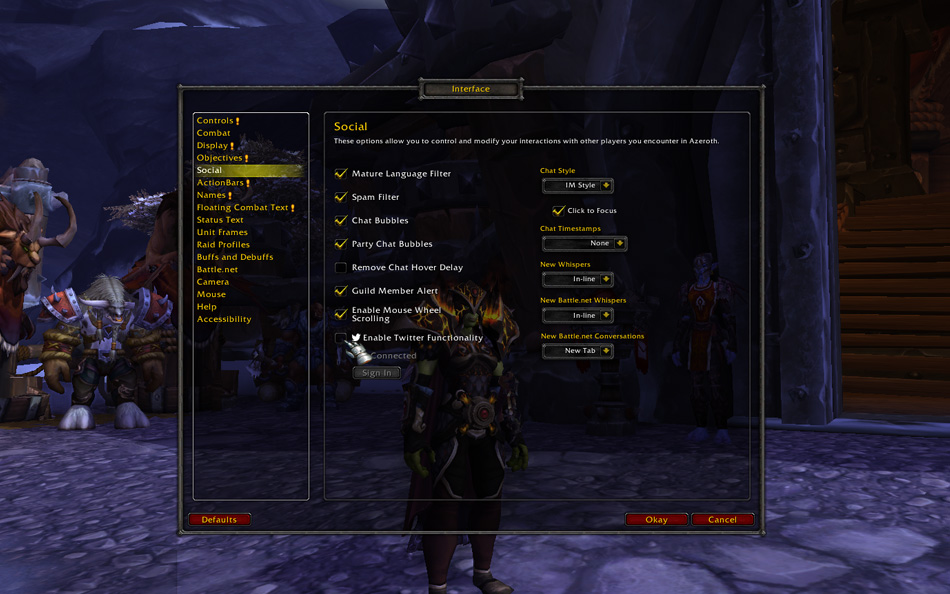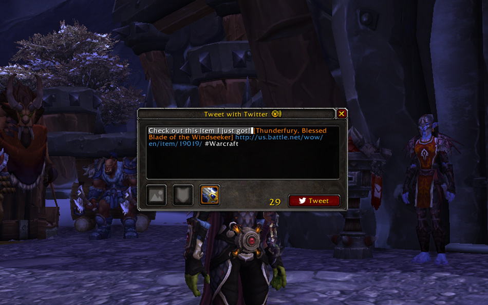 Les tweets envoyés depuis World of Warcraft ne sont créés qu’à votre initiative. Nous n’enverrons jamais de tweets automatiques à votre place. En ce sens, nous avons également désactivé cette fonction pour les add-ons. Notre objectif est de faciliter l’envoi de vos tweets en cours de partie sur World of Warcraft, ainsi que le partage d’éléments comme les objets, les hauts faits et les captures d’écran.