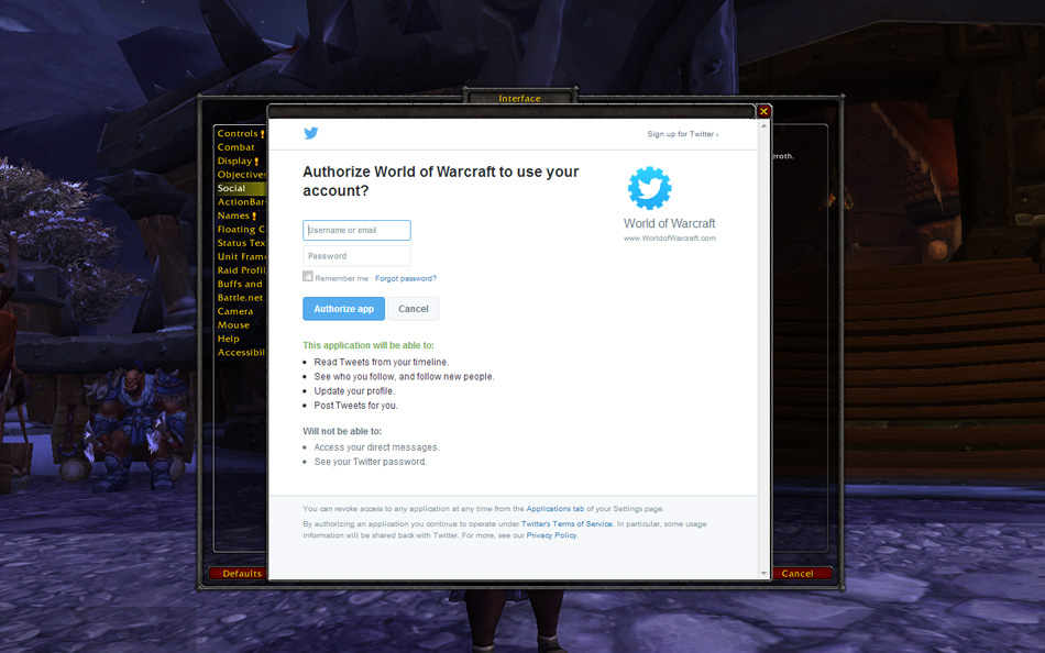 Le système d’autorisation de l’application Twitter n’offre que quelques paliers accessibles aux développeurs d’applications. Nous avons donc choisi les paliers les plus basiques dotés des accès les moins élevés. Ceux-ci dressent la liste de fonctionnalités inutilisées par cette intégration (et dont l’utilisation n’est pas prévue), comme celles que vous avez mentionnées. L’application Twitter pour World of Warcraft n’existe que pour vous permettre de tweeter depuis World of Warcraft. Vous seul pouvez créer et envoyer un tweet.