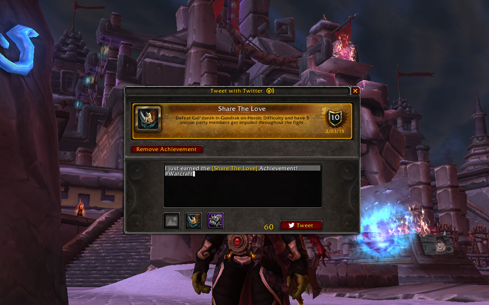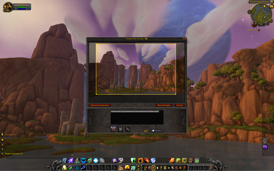 Une nouvelle fonctionnalité va faire son apparition avec la mise à jour 6.1. Elle vous permettra de tweeter directement depuis World of Warcraft via votre compte Twitter. Vous pourrez ainsi envoyer des tweets textuels, prendre des captures d’écran facilement et les recadrer avant de les tweeter, et tenir vos amis informés des derniers objets que vous avez acquis, ainsi que de vos hauts faits les plus récents.