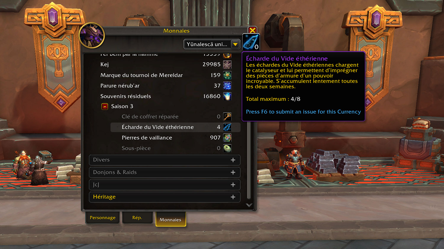 - Catalyseur : une monnaie rechargeable par les donjons en mythique+, raid, JcJ côté et Gouffres pour convertir l'équipement.