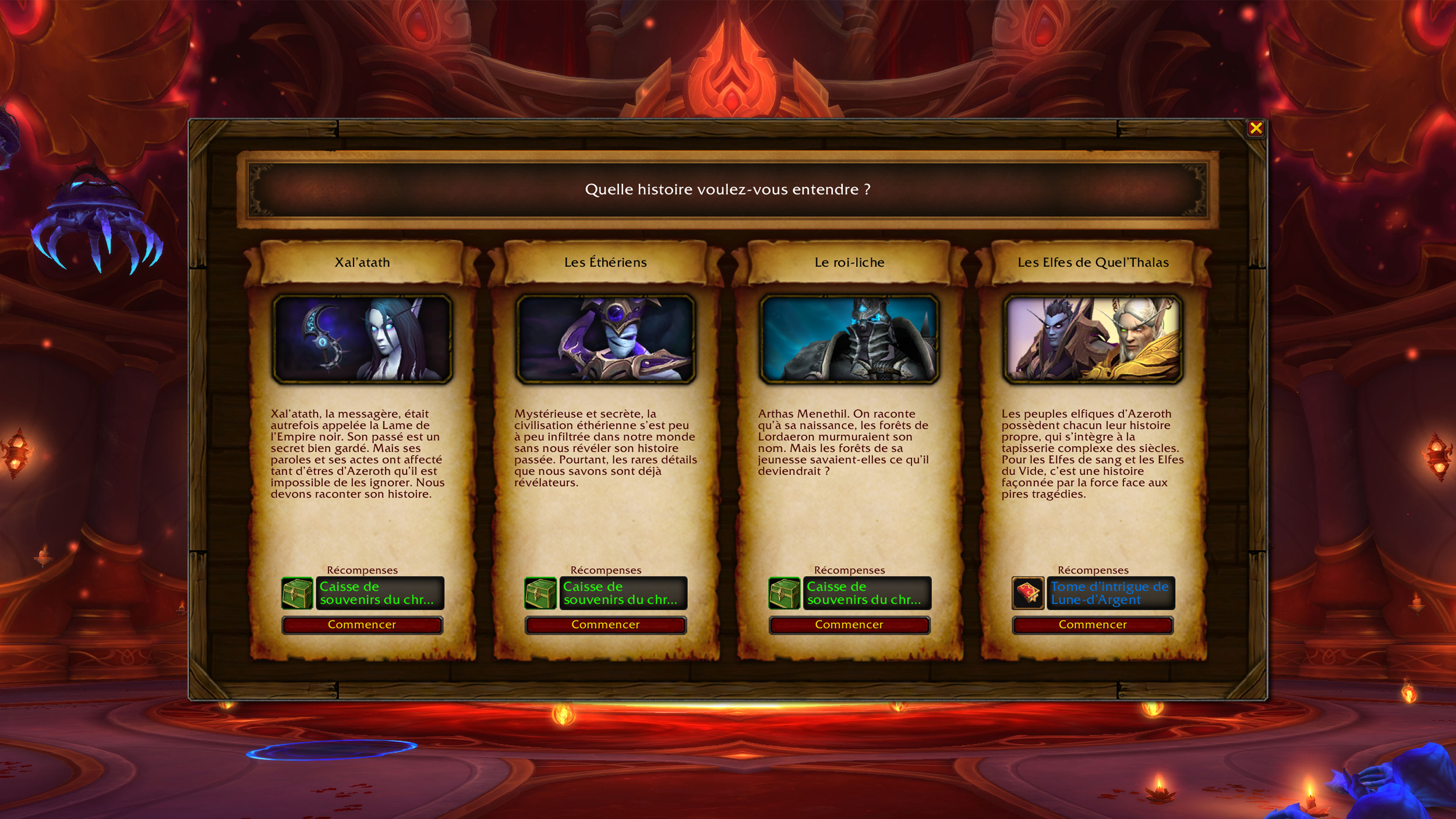 - Résumé de The War Within (niveau 70 à 80) : une session de jeu accélérée est proposée pour les personnes qui ont raté l'histoire de l'extension (ou se rafraîchir la mémoire). Ce parcours de jeu condensé permet de découvrir l’intégralité de l’histoire de l’extension entre le niveau 70 à 80 avec le visionnage des cinématiques clés et les histoires essentielles des personnages principaux. Ce voyage débute sur l’île de Dorn jusqu’à atteindre le monde brisé de K’aresh. Le chroniqueur Cho transmet un parchemin anonyme dans le journal de quêtes après une longue interruption sur le jeu pour retracer les récents événements essentiels et comprendre la menace à venir dans Midnight. Cette fonctionnalité est répétable depuis le tome d'histoire des chroniques à Dornogal, Hurlevent ou Hurlevent.