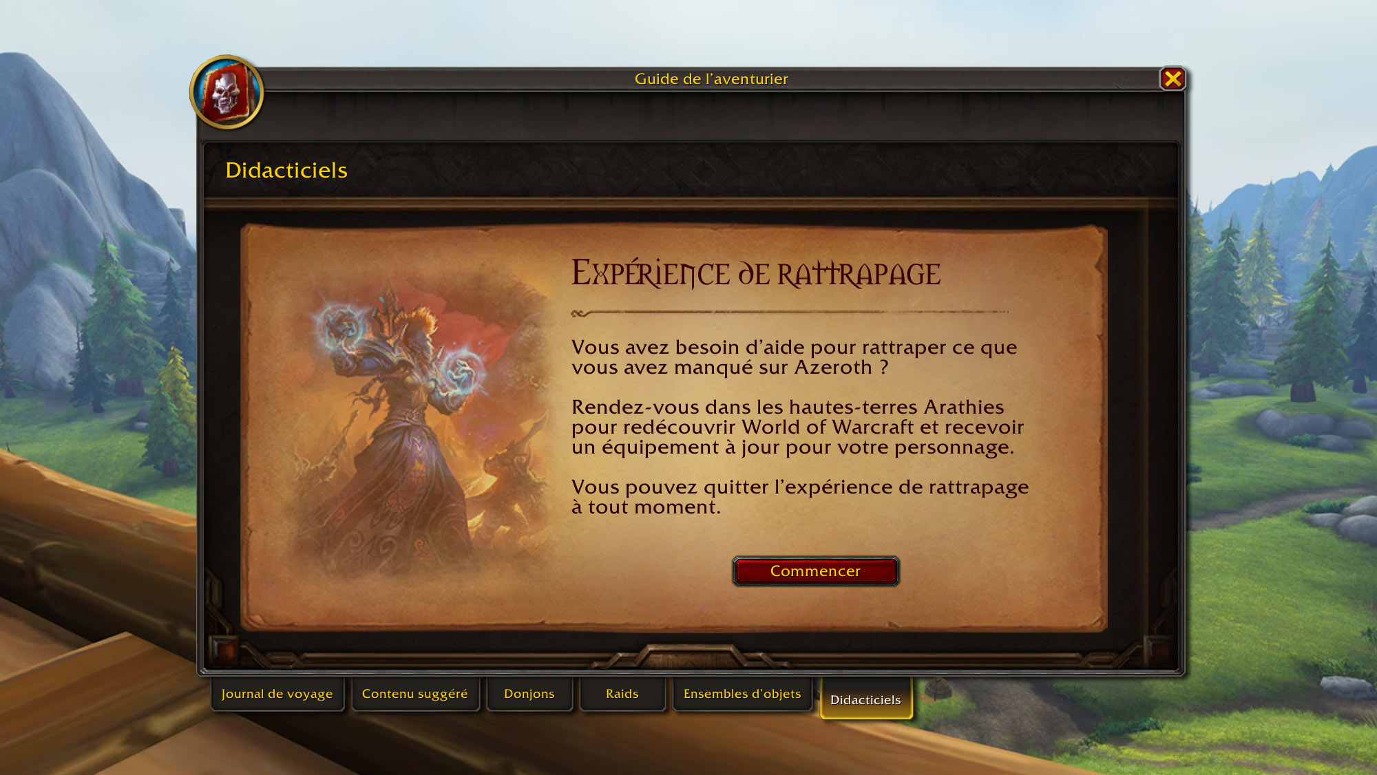 - Expérience de rattrapage (niveau 10 à 80) : un nouveau didacticiel est ajouté au guide de l'aventurier ou à l'écran de sélection des personnages pour participer à une expérience de rattrapage dans les hautes-terres Arathies en aidant Thrall et Jaina. Une fois qu'elle est démarrée, cette expérience optimisée masque les quêtes existantes, nettoie l'inventaire et réattribue les points de talents pour se réacclimater au jeu et au personnage avant de se relancer dans l'aventure. Cette nouvelle expérience de jeu propose également de nouveaux didacticiels pour la fonctionnalité de Vol dynamique et le système d’interruption. À la fin de cette suite de quêtes, vous recevez de l’équipement adapté à votre niveau pour plonger au cœur de l’action.
