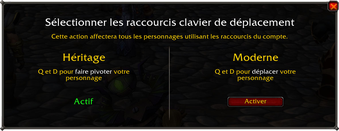 La première connexion du personnage propose un nouveau choix sur le comportement du déplacement sur les raccourcis claviers de déplacement entre Héritage ou Moderne pour faire pivoter ou déplacer le personnage avec les touches Q et D par défaut.