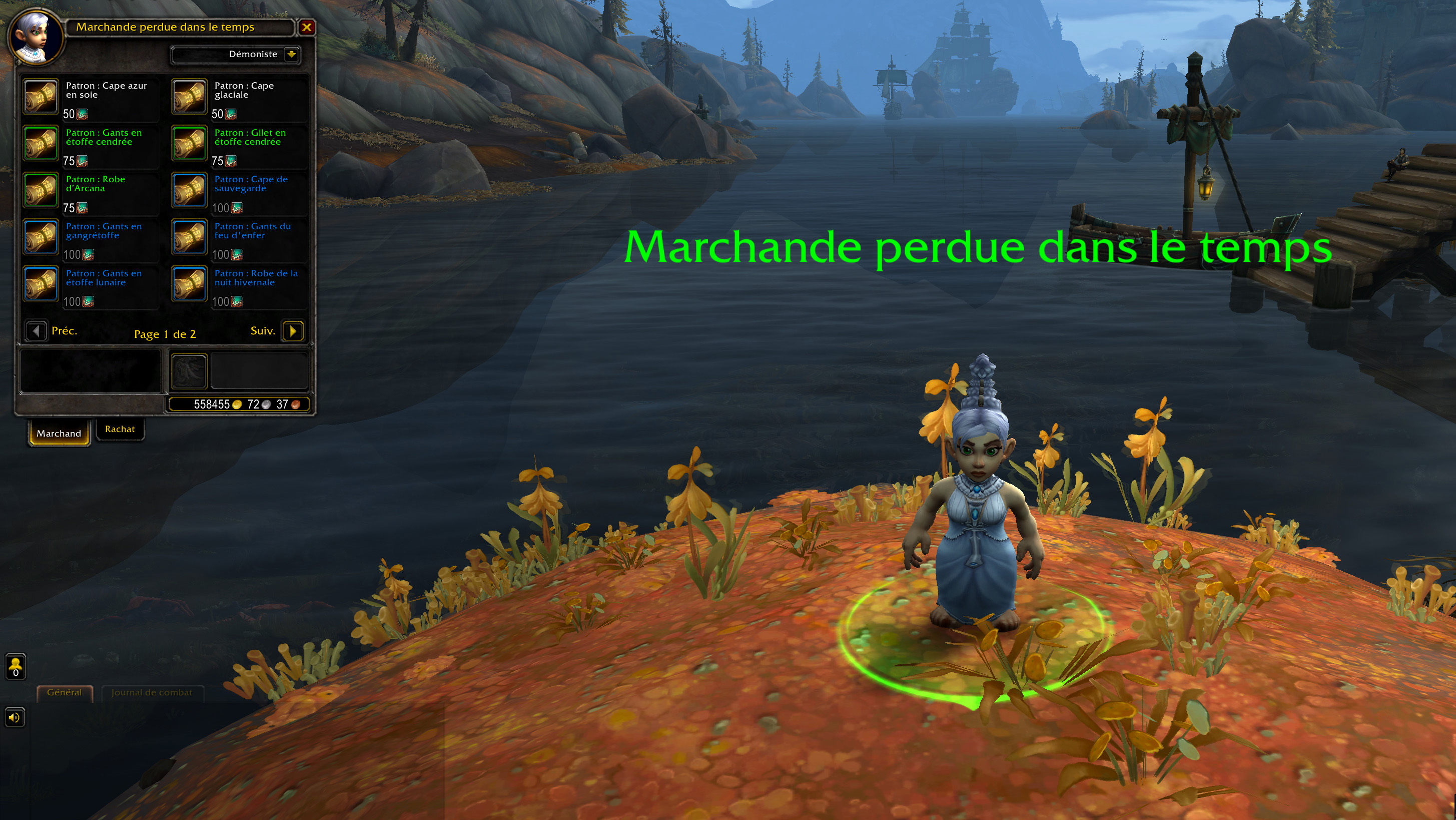 La dévastation des Royaumes de l'Est et Kalimdor par Aile de mort au cours de l'extension Cataclysme a complètement bouleversé l'écosystème des régions du monde sur Azeroth. Depuis ce jour, plusieurs recettes de métiers ont sombré dans le néant distordu suite à la refonte des anciennes zones. Dans la mise à jour 8.1.5, les couturiers de Battle for Azeroth pourront découvrir une marchande perdue dans le temps à l'aide de l'outil de travail du Fil synchrone afin de sceller les failles temporelles sur Kul Tiras et Zandalar. Cette marchande perdue dans le temps propose plusieurs anciennes recettes à collectionner pour des nouvelles apparences uniques.