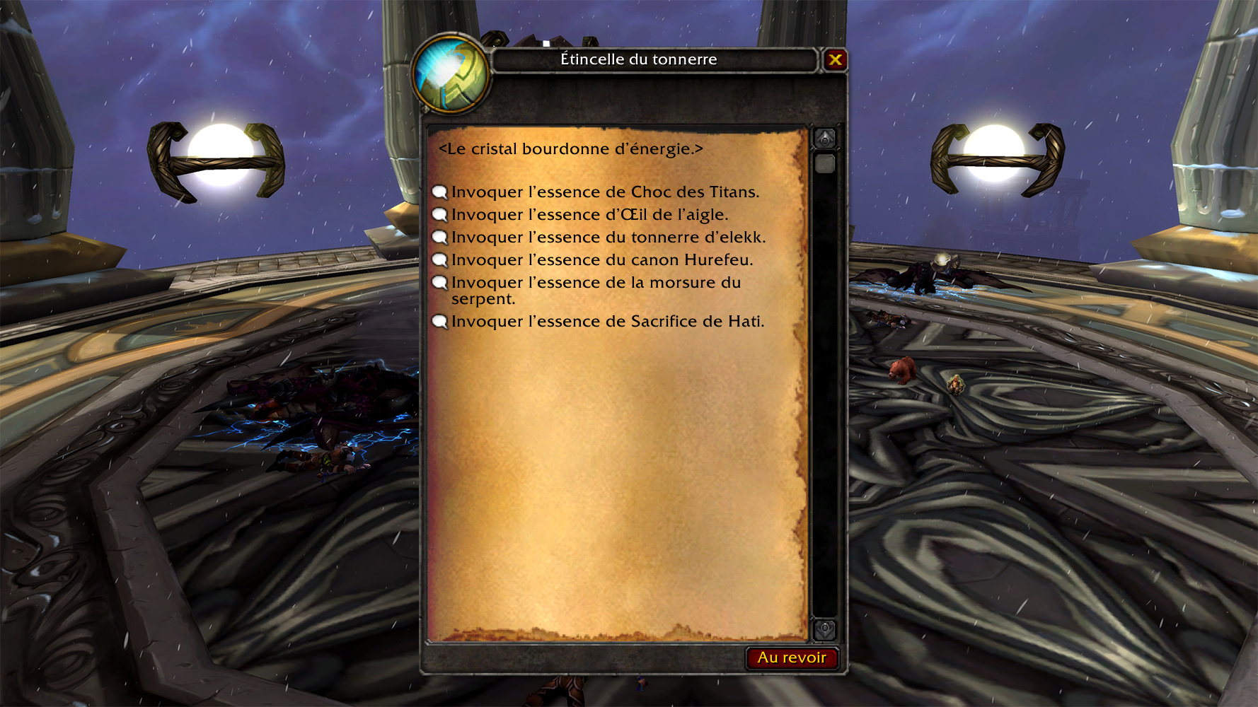 L'étincelle du tonnerre est pleinement chargée avec de l'énergie volatile des deux essences rémanentes de Hati. Mimiron vous donne rendez-vous dans son atelier à Ulduar pour rematérialiser Hati grâce à l'étincelle du tonnerre par un rituel. Avant de pouvoir démarrer cette résurrection, un emplacement de familier doit être disponible pour dompter cette créature exotique.