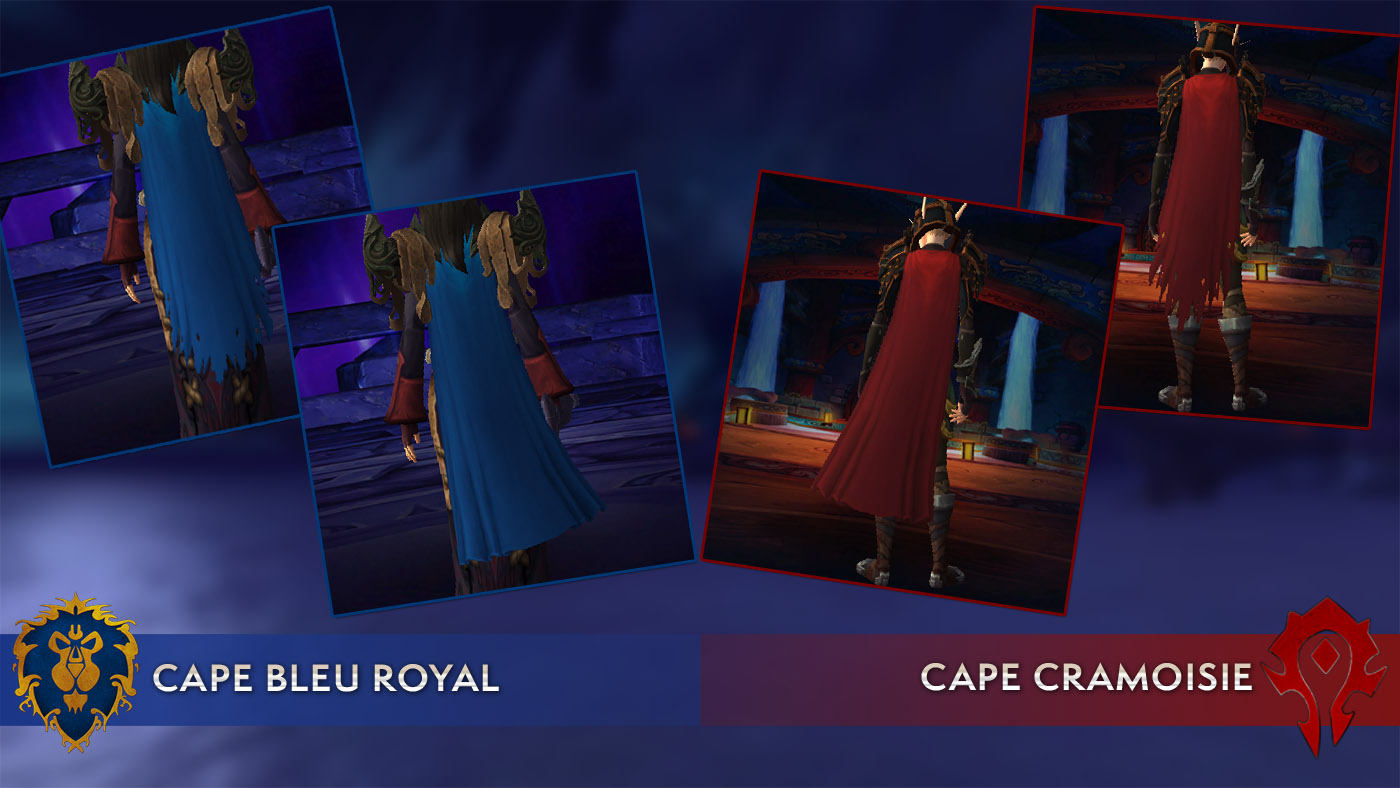 - Cape cosmétique : la cape bleu royal ou cramoisie est liée quand équipée pouvant être échangée ou vendue