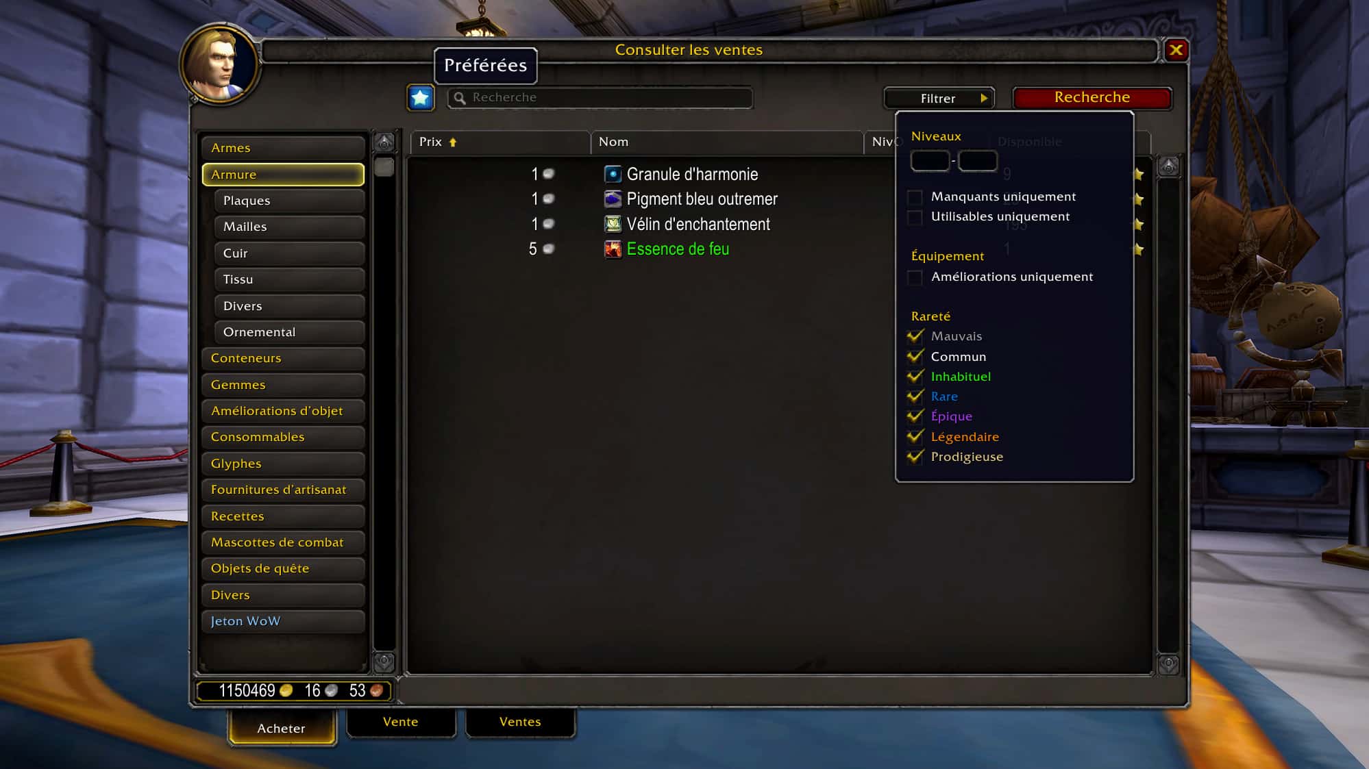 - Niveaux (déjà disponible) : permet de filtrer par une tranche de niveaux pour les pièces d'équipement et objets divers.