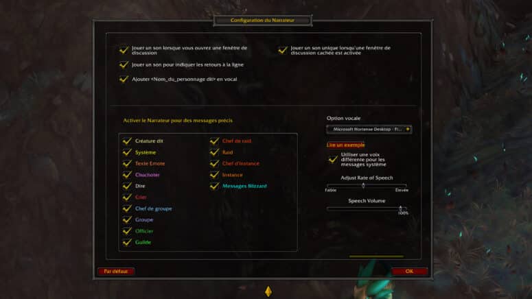 Une fois que le narrateur pour la discussion est activé dans les options d'accessibilité, le texte de la fenêtre de discussion est lu vocalement par une voix sélectionnée au préalable. Il est possible de configurer la retranscription des messages précis par le Narrateur sur la fenêtre de discussion classique comme système, texte Emote, canal de guilde ou raid et plus encore. Cependant, il n'est pas possible de retranscrire en audio tous les messages sur les canaux généraux et commerces pour des raisons évidentes.