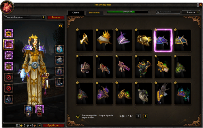 - Une option est disponible chez le transmogrifier pour changer l'apparence de chaque épaules séparément.