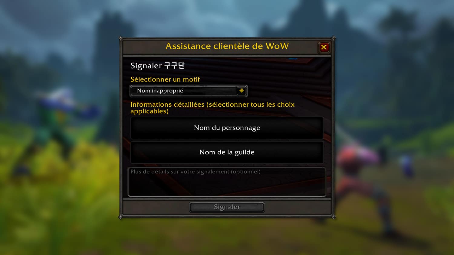 - Nom inapproprié : Nom du personnage, Blizzard BattleTAG, Nom du groupe personnalisé, Nom de la guilde.