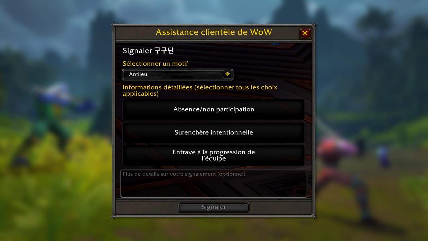 À partir de la mise à jour mineure 9.2.5, l'interface de signalement a été retravaillé avec plusieurs nouvelles catégories à propos du motif des mauvais comportements observés. Cette nouvelle option de signalement va permettre aux joueurs de mieux indiquer la catégorie de l'incident entre un nom inapproprié, du comportement ou de la triche pour que l'assistance clientèle de WoW puisse ainsi prendre la mesure appropriée au litige s'il ne remplit pas l'une des conditions du code de conduite du jeu. Cette interface permet également d'indiquer un message personnalisé pour informer avec les détails supplémentaires si nécessaire.