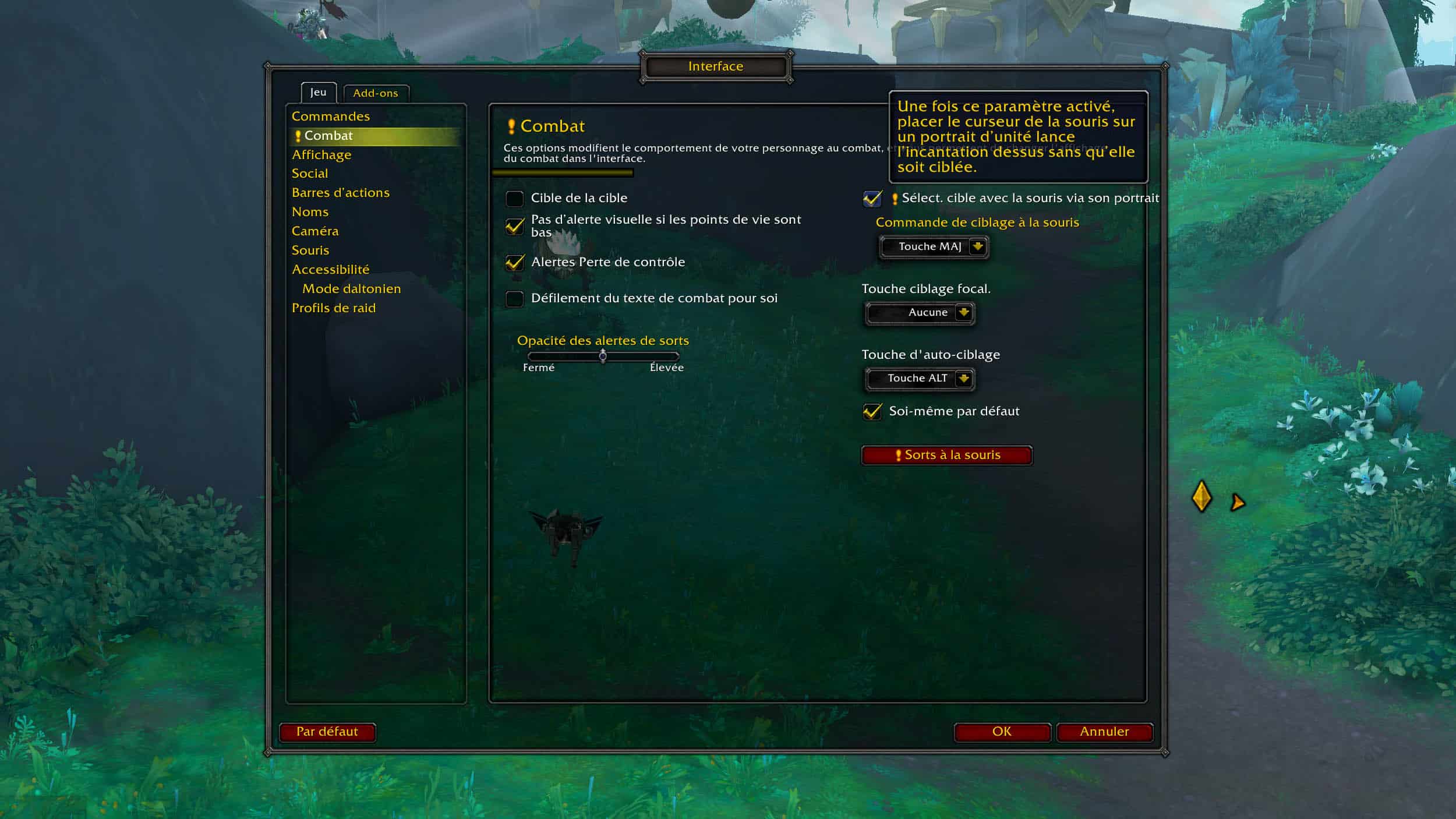 - Les raccourcis par défaut (clic gauche et droit) concerne le ciblage du portrait d'unité et l'ouverture du menu contextuel.