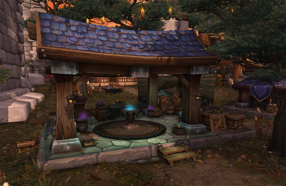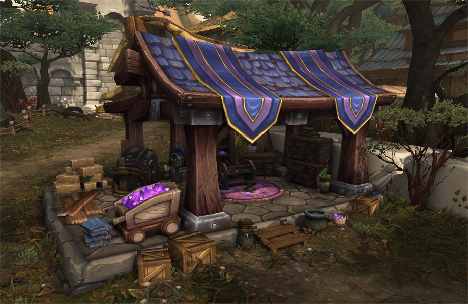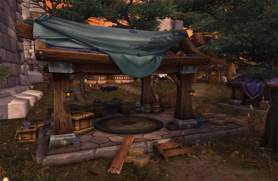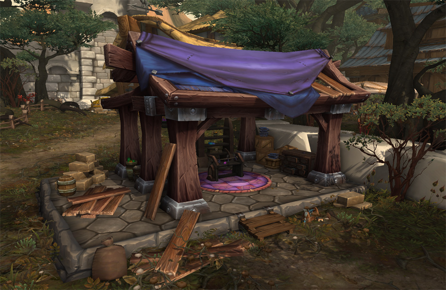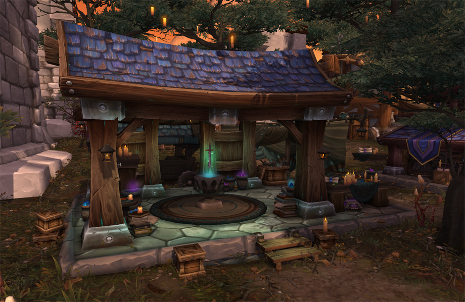 Au début de la phase de développement des fiefs, nous avons décidé de commencer par les bâtiments de l’Alliance, que nous allons vous présenter aujourd’hui. Nous nous sommes dit qu’il serait amusant pour les joueurs de découvrir certains des bâtiments originaux d’Elwynn et des Carmines. Jimmy Lo, notre artiste conceptuel a proposé de revisiter le passé en remettant certains des premiers édifices au goût du jour. Nous avons tenté de conserver certaines des particularités les plus reconnaissables des bâtiments, tout en y appliquant de nouvelles textures pour l’extension à venir. Après quelques essais, nous nous sommes rendu compte que ces bâtiments étaient peut-être tropfamiliers, qu’ils ne se prêtaient pas vraiment à une refonte épique et ne correspondaient pas à notre nouvelle fonctionnalité. Nous avons donc décidé d’aller encore plus loin et de faire bien plus que simplement rafraîchir un vieux bâtiment. Nous avons donc bâti le nouveau sur les fondations de l’ancien. Tout en conservant l’esprit d’origine des vieux bâtiments, nous avons commencé à explorer de nouveaux concepts. Nous avons élaboré de nouvelles silhouettes et mis en avant les spécificités de chaque bâtiment, créant ainsi des améliorations visuellement captivantes, à découvrir au fil du jeu. Ainsi, quand les joueurs verront une grosse caisse en bois et une scie émoussée, ils sauront qu’il s’agit d’une scierie de premier niveau. Quand leur armée sera assez importante et qu’ils auront enfin accès à la scierie de troisième niveau, croyez-moi, la Horde de Fer ne leur fera plus peur ! Je dois l’avouer, j’ai un très gros faible pour la tour des mages. D’accord, j’en suis carrément amoureuse ! Sa bibliothèque aux étagères bien garnies invite le joueur à bouquiner ses grimoires préférés (le mien, c’est « Les sorts de Béatrice : voyage dans les terres sauvages de Hardivar »), emmitouflé dans une couverture et pelotonné avec son familier préféré dans un fauteuil confortable, tandis que les flammes de l’âtre s’éteignent doucement. Lors de la création artistique, ce sont ces petites narrations qui guident l’élaboration de la scène. L’éclairage, le choix des matériaux, les silhouettes et la minutie des détails stimuleront l’imagination du joueur et lui donneront envie de voir au-delà des pixels et des textures pour abandonner son personnage à son environnement. J’ai tendance à considérer les bâtiments comme des personnages ; chacun possède une personnalité qui lui est propre, depuis les petites imperfections à l’embrasure d’une porte jusqu’à la chaleur réconfortante de la cheminée de l’hôtel de ville. Je suis sûre que vous saurez apprécier l’amour et l’attention que nous avons portés à tous ces détails. Je m’appelle Eric Browning, je suis responsable de la conception graphique des accessoires, et mon équipe est chargée des effets spéciaux et des décors de base dans WoW. Pour les fiefs, nous avons plus que jamais mis l’accent sur l’aspect « décor », ce qui nous a permis de mieux appréhender la validité d’unkiten particulier dès le début. Mais je laisse aux trois infographistes concernés le soin de vous expliquer tout cela. « L’un des plus puissants outils de l’infographiste est sans conteste la narration, et l’occupation de l’espace dans les fiefs nous a vraiment permis de nous concentrer sur cet aspect. Décorer un ensemble ou un bâtiment précis permet d’apporter une perspective unique à la façon dont l’espace est utilisé, la façon même dont il est créé et la manière dont tous les éléments se combinent pour véhiculer un thème global. Les petits détails et nuances des accessoires peuvent aider le joueur à mieux appréhender l’atmosphère d’une zone donnée du jeu et contribuent à relater l’histoire de la zone tout entière. Nous abordons chacune de ces tâches dans leurs détails tout comme dans leur globalité ; nous évaluons la façon dont toutes les petites parties s’emboîtent pour former le tout. Et c’est là que réside toute la difficulté, car nous devons offrir au joueur des éléments visuels marquants et de grande qualité, dignes de World of Warcraft, sans l’agresser visuellement. » —Jordan Powers, concepteur graphique associé « Dans Warlords of Draenor, votre fief est votre forteresse, votre base dans un monde hostile, mais aussi, et surtout, votre foyer. L’un de nos principaux objectifs était non seulement d’apporter un peu de vie aux personnages qui peuplent le monde, mais aussi de leur donner un but et un sentiment d’appartenance à leur environnement. En tant qu’infographistes, il nous a fallu discuter, évaluer et développer un scénario qui donne une histoire à un espace précis et qui aide également le joueur à se sentir dans un monde cohérent et réaliste. Nous nous efforçons de donner à chaque ensemble d’accessoires (ou « kit ») un rôle et une place logiques afin d’affirmer l’appartenance d’un PNJ à un lieu particulier. Nous espérons ainsi pouvoir offrir au joueur une expérience visuellement plus riche et gratifiante. » —Eric Braddock, concepteur graphique 3D associé « En ce qui concerne les bâtiments liés aux métiers, nous souhaitions que le joueur soit en mesure d’évoluer non seulement avec ses points de compétences, mais aussi visuellement à travers son fief. A mesure que le joueur progresse, chaque bâtiment lié à un artisanat se développera viset le bâtiment deviendra de plus en plus imposant au fil de la progression du personnage-joueur. Chacun de ces bâtiments a été pour nous l’occasion de décrire le PNJ qui y travaille ; son apparence soignée ou au contraire négligée, la façon dont il travaille et la manière dont il évolue à vos côtés à mesure que votre fief se développe. Nous avons également pensé qu’il serait intéressant d