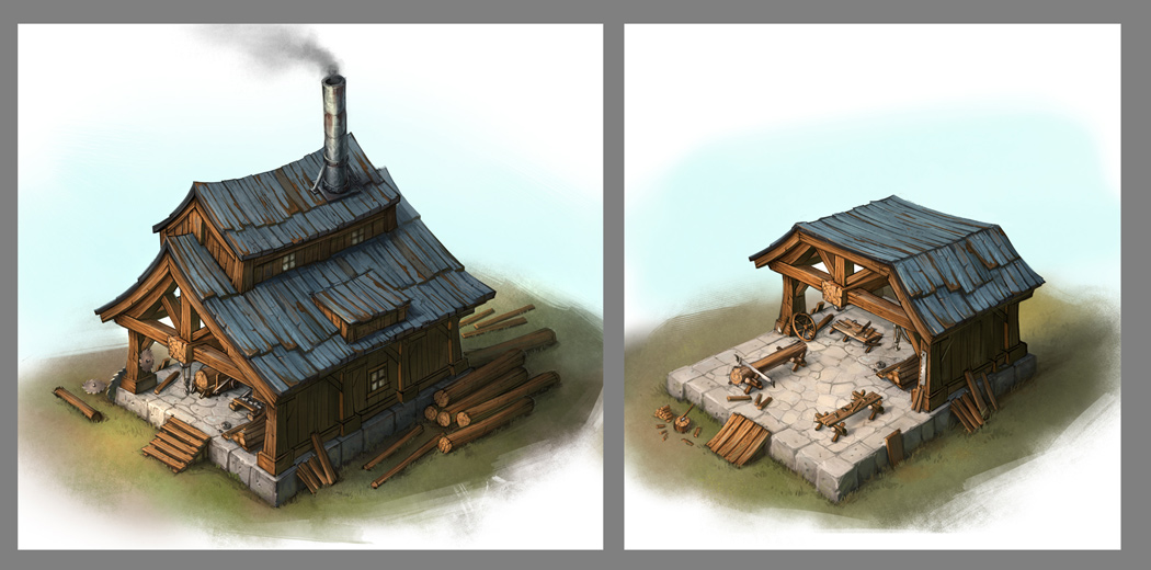 Trouver l’apparence idéale n’était que l’une des nombreuses tâches à accomplir. L’accroissement progressif de la puissance des fiefs étant un élément essentiel de cette fonctionnalité, nous voulions refléter cette évolution dans les graphismes. Concrètement, chaque bâtiment de fief doit pouvoir évoluer en versions de plus en plus épiques. Le système de construction des fiefs (qui permet de personnaliser leur agencement et de placer les bâtiments où bon vous semble) a représenté un véritable défi pour l’équipe artistique, car si le bâtiment doit être plus épique à chaque amélioration, ses fondations, elles, doivent rester inchangées. Voici quelques exemples des travaux en cours de développement ci-dessous.