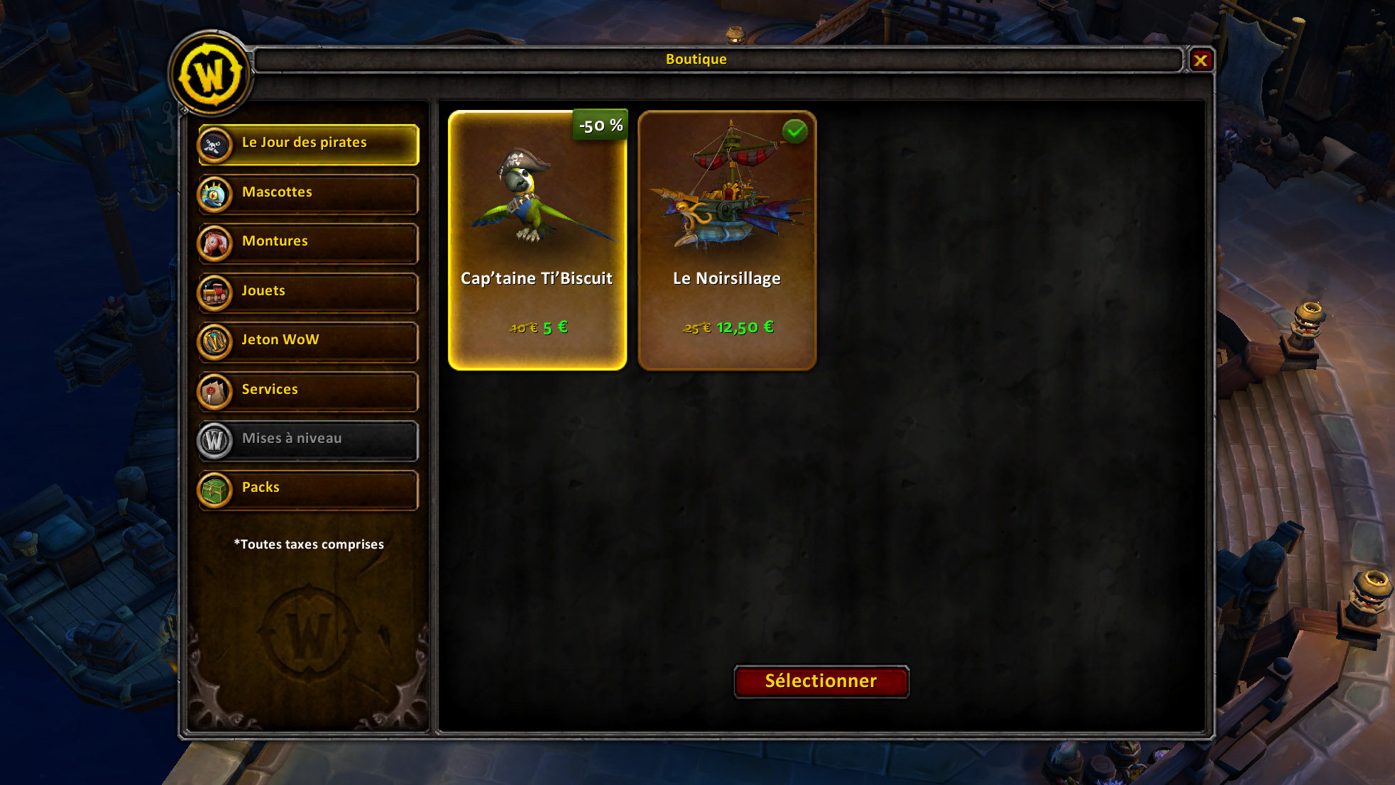 Une réduction exceptionnelle est disponible dans la boutique de Blizzard pour acheter la monture Noirsillage et la mascotte Cap’taine Ti’Biscuit pour célébrer l'événement mondial de la journée des Pirates. Cette promotion de 50% sur ces deux objets permet d'économiser quelques euros pour agrandir sa collection de montures et mascottes. Du 18 au 20 septembre 2019 à minuit (heure de Paris), vous pouvez ainsi acheter la monture Noirsillage à 12,50€ (au lieu de 25) et la mascotte Cap’taine Ti’Biscuit à 5€ (au lieu de 10) avant que devoir payer plein pot pendant le reste de l'année. Notez que la monture à deux places du navire pirate Noirsillage a été offert pour avoir acheté 6 mois d'abonnement au cours de l'événement de l'année dernière.