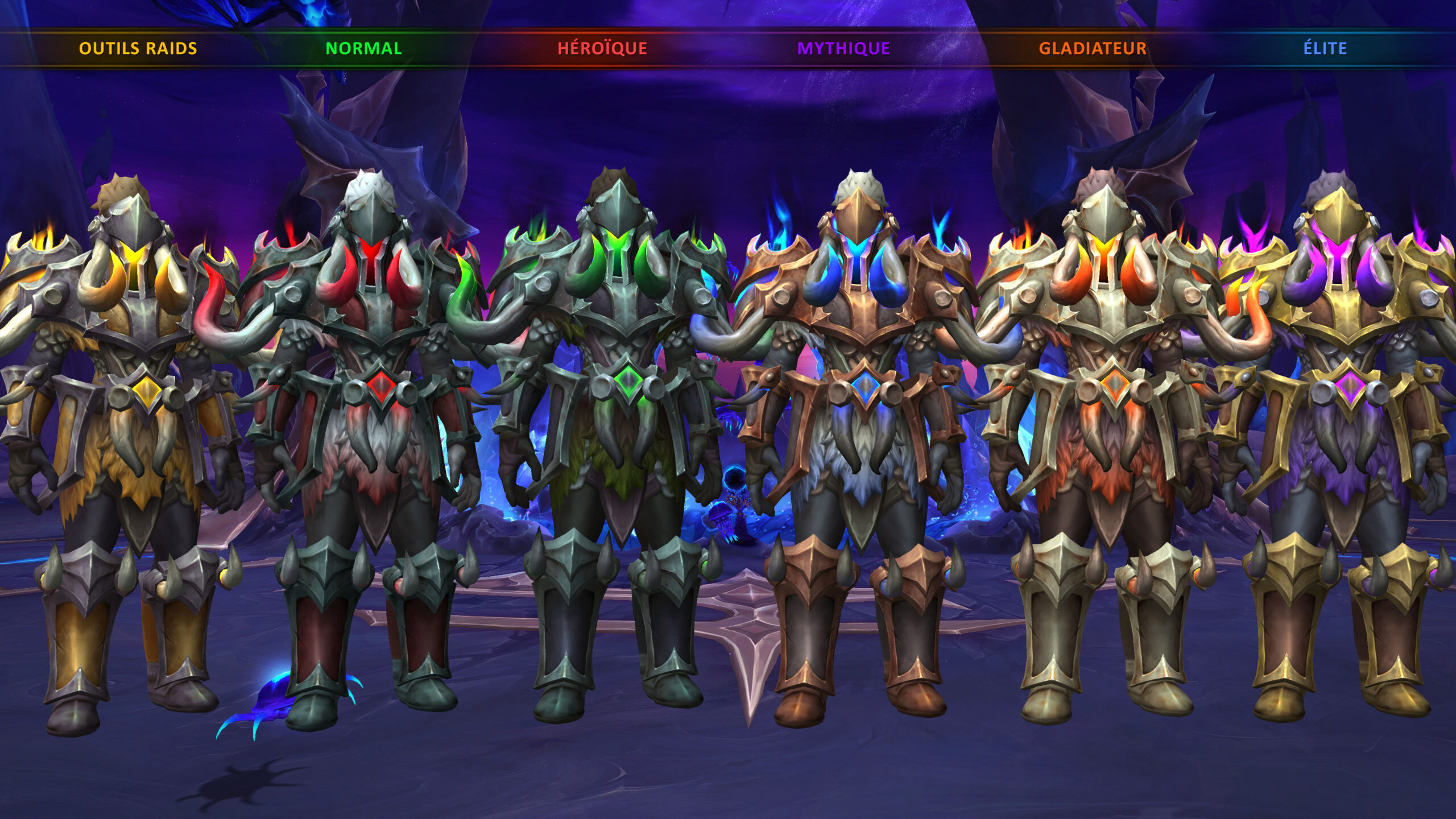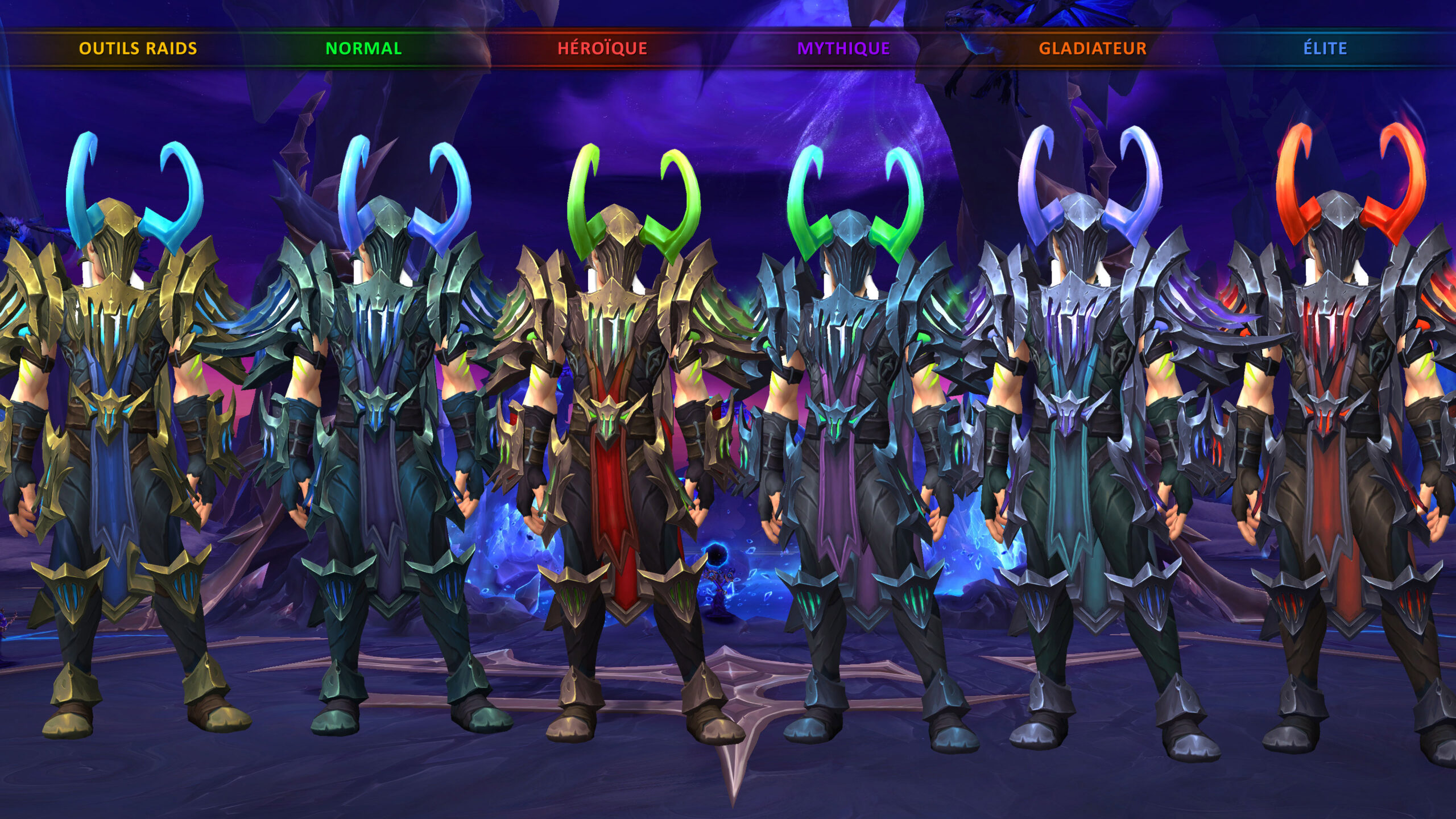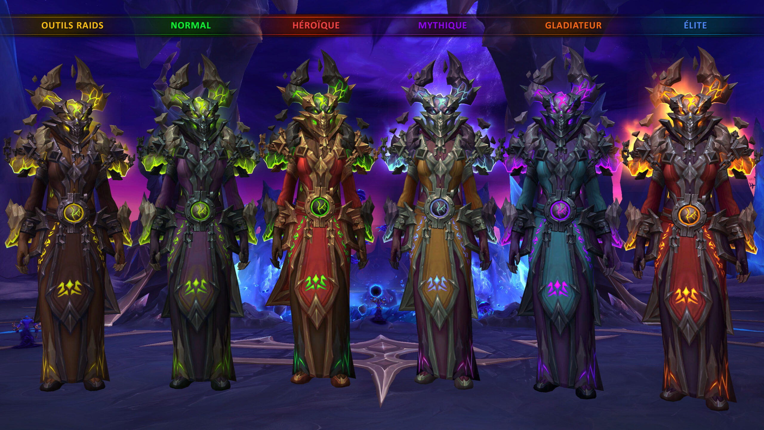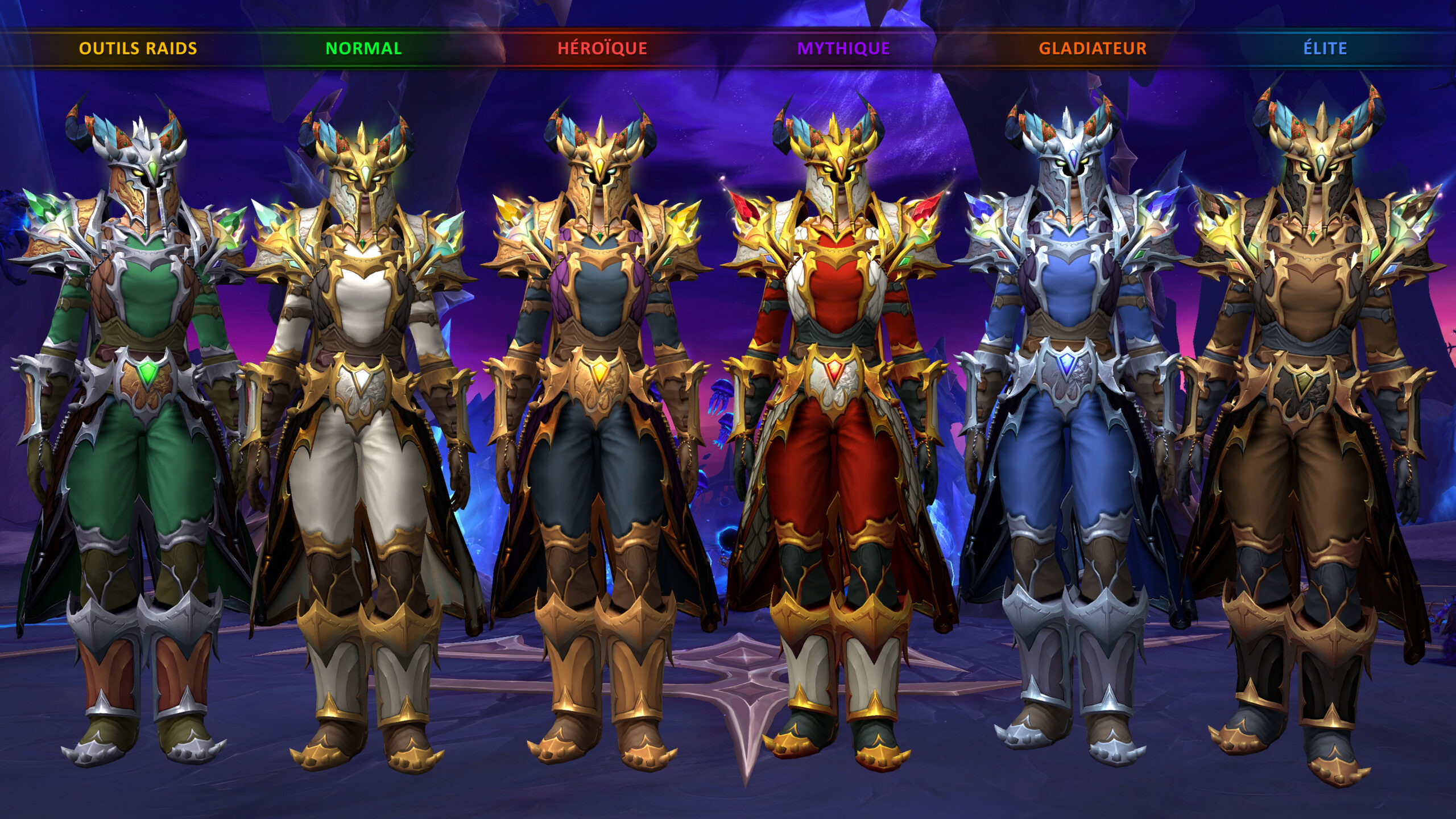 Une nouvelle mécanique permet de débloquer toutes les variations précédentes lorsque vous complétez un ensemble de la difficulté supérieure. Lorsque vous obtenez les 9 pièces de l'ensemble (hors sets y compris) en mode mythique, vous obtenez automatiquement les teintes de couleurs en mode outils raids, normal et héroïque.