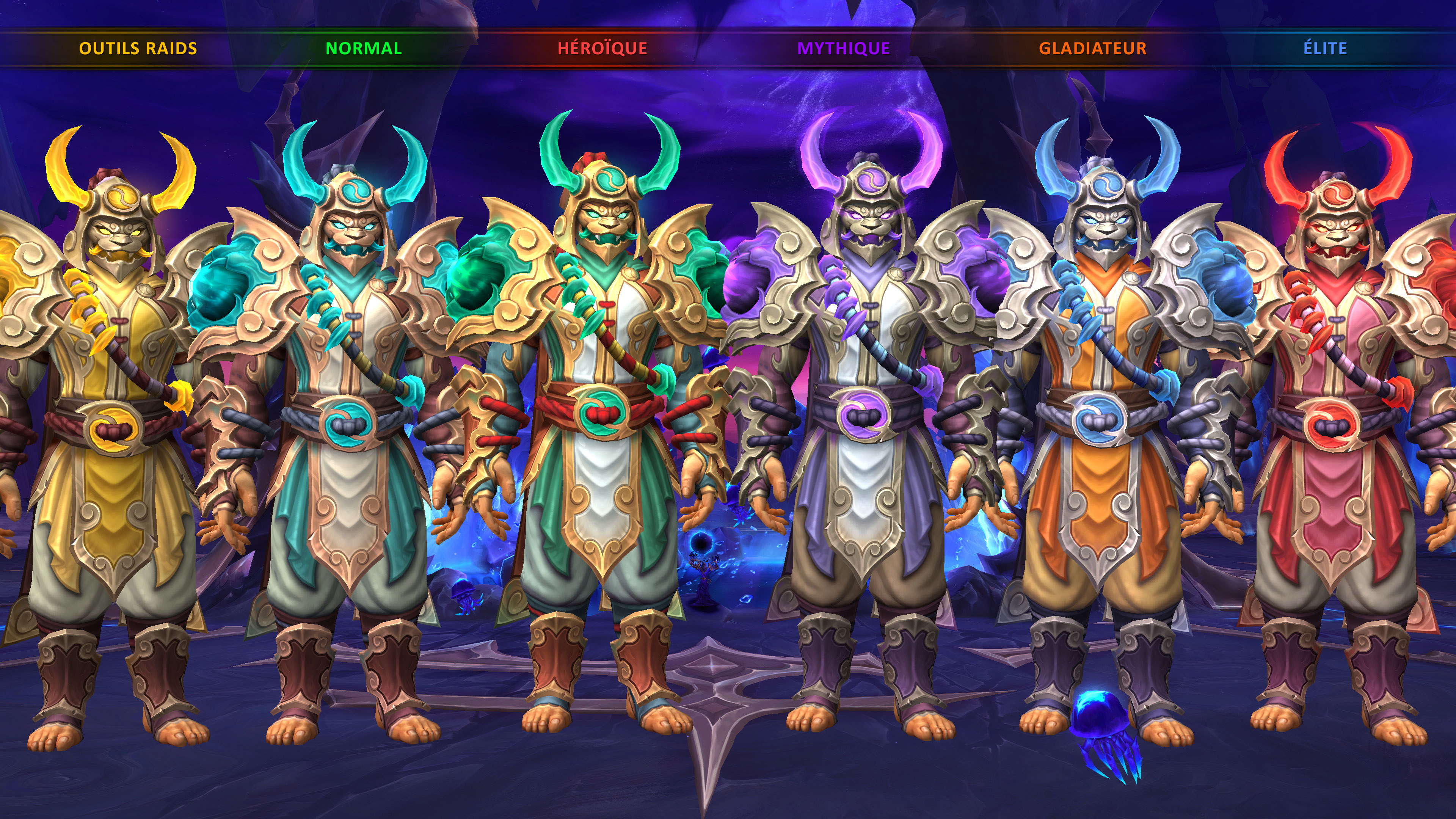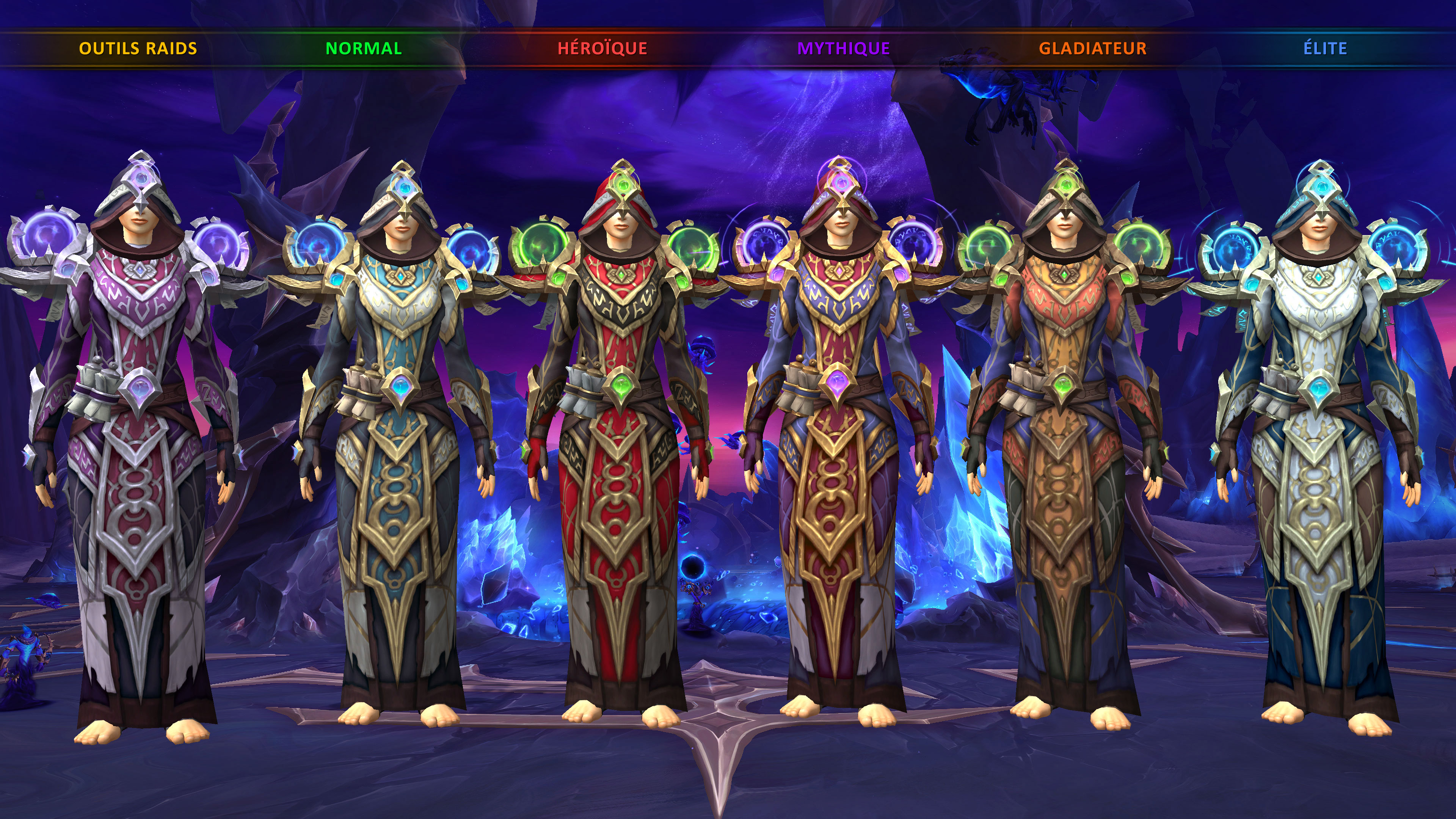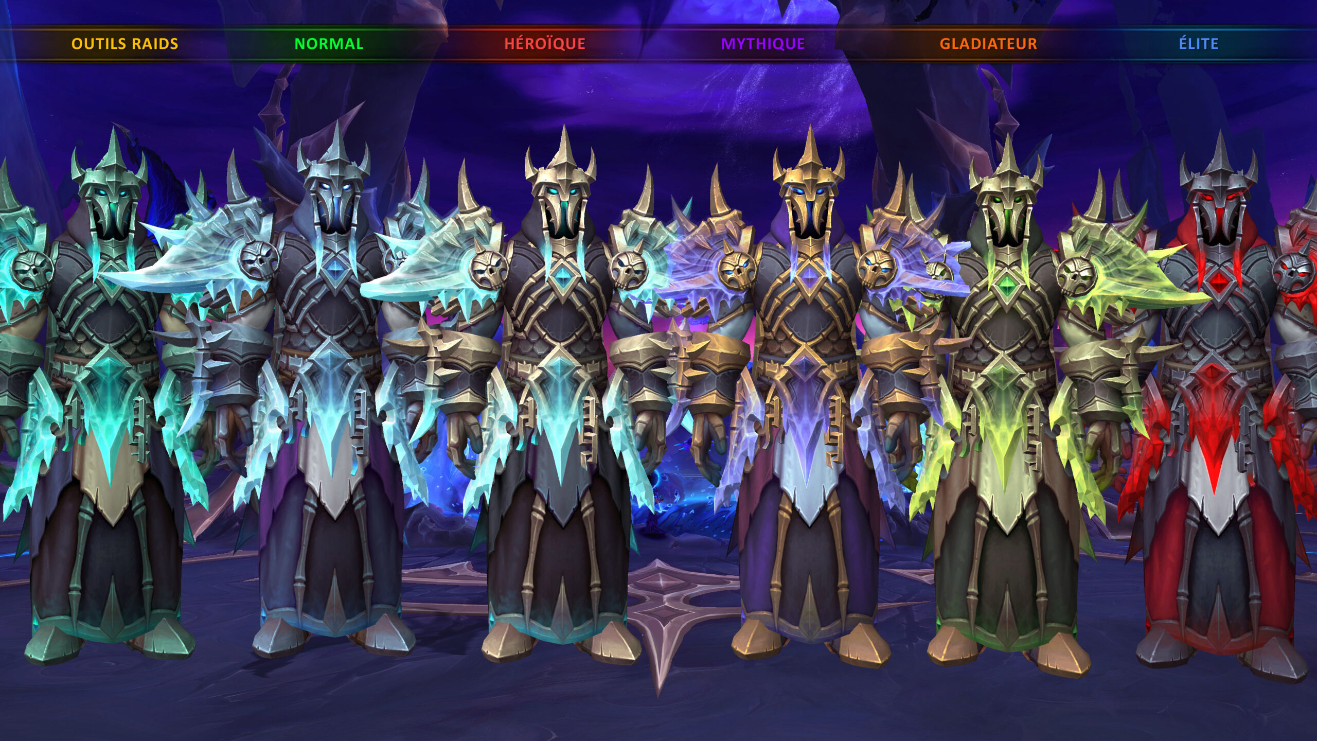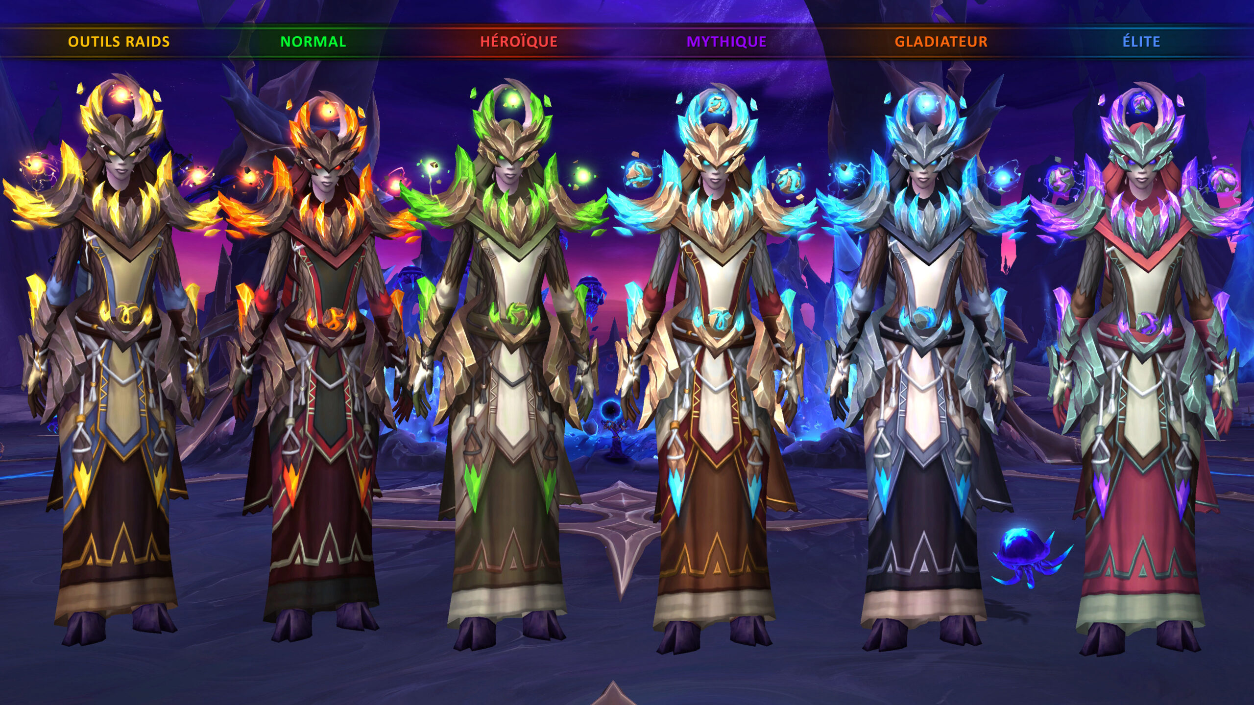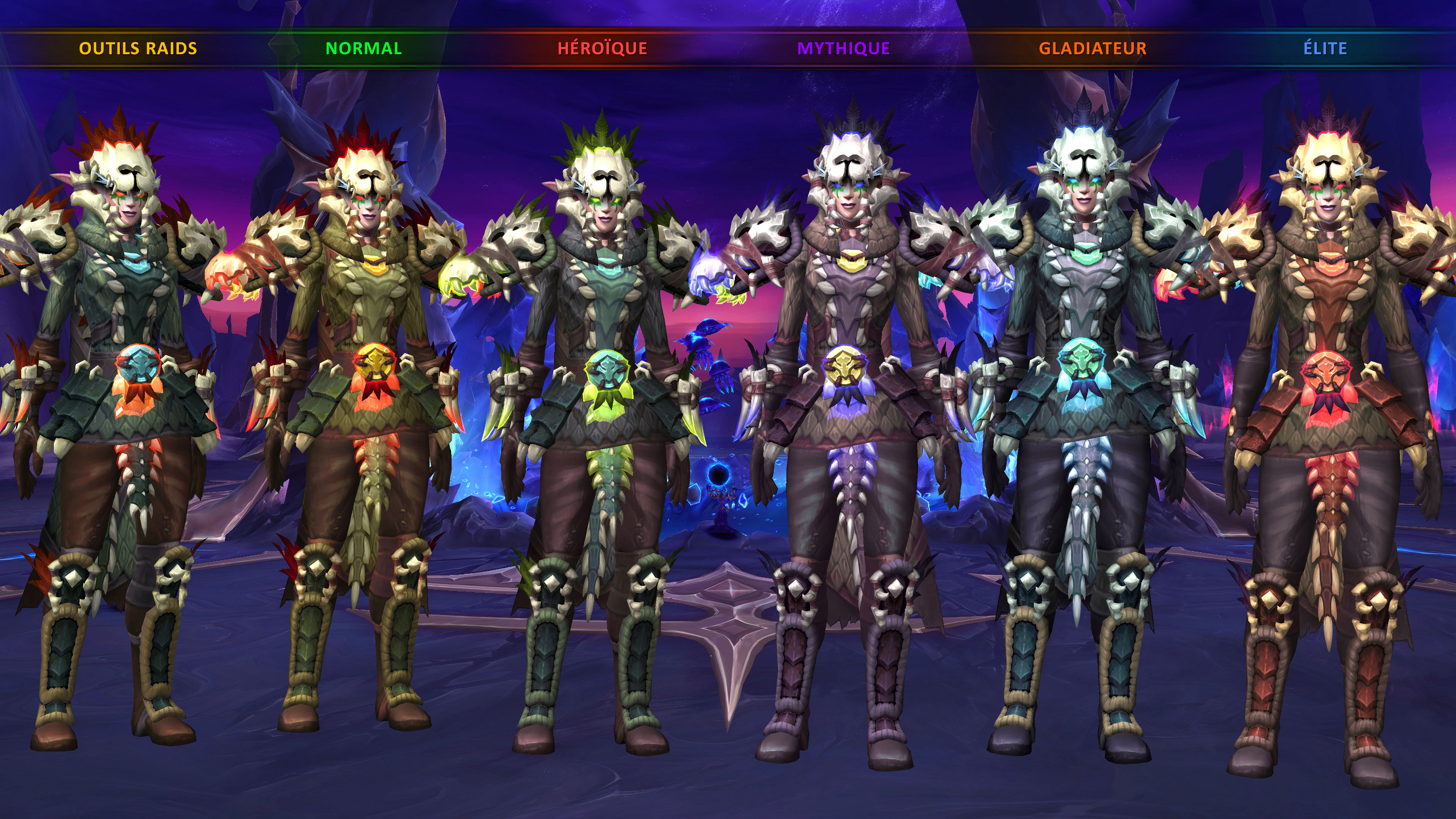 Une nouvelle mécanique permet de débloquer toutes les variations précédentes lorsque vous complétez un ensemble de la difficulté supérieure. Lorsque vous obtenez les 9 pièces de l'ensemble (hors sets y compris) en mode mythique, vous obtenez automatiquement les teintes de couleurs en mode outils raids, normal et héroïque.
