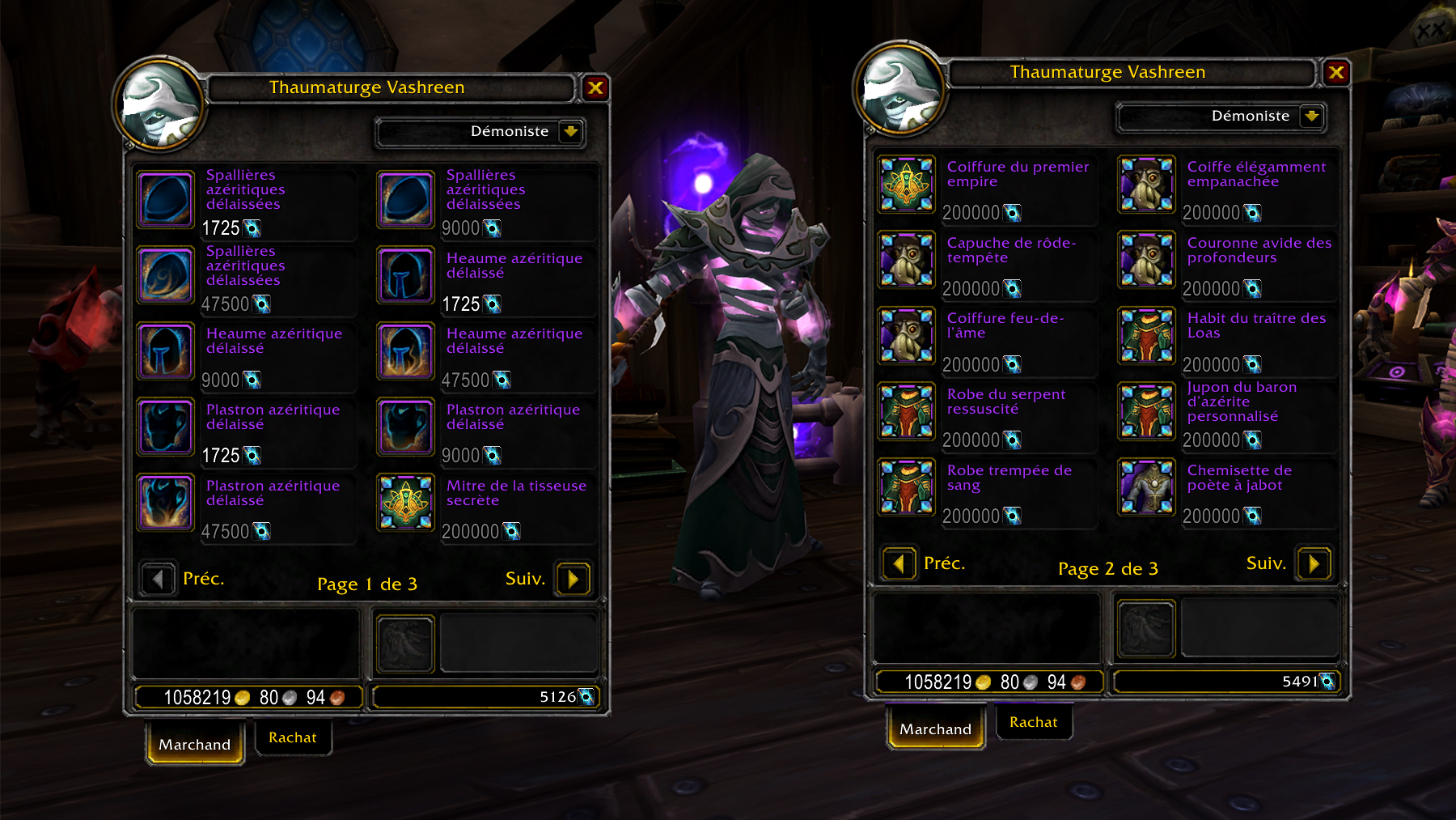 Au lancement de la saison 3 de Battle for Azeroth, à partir du 10 juillet 2019, le Thaumaturge Vashreen est mis à jour pour proposer une nouvelle plage de niveaux d'objets aux armures azéritiques. Cet intendant éthérien accepte la monnaie d'échange du résidu des titans pour vendre des pièces d'équipement azéritiques spécifiques ou aléatoires des donjons mythique+ avec un niveau d'objet de 415, 430 et 445 au maximum à l'ouverture du palais Éternel. Le développeur du jeu Ion Hazzikostas a affirmé que cette monnaie ne sera pas réinitialisée, mais le coût pour obtenir une armure améliorée sera beaucoup plus élevée qu'auparavant.