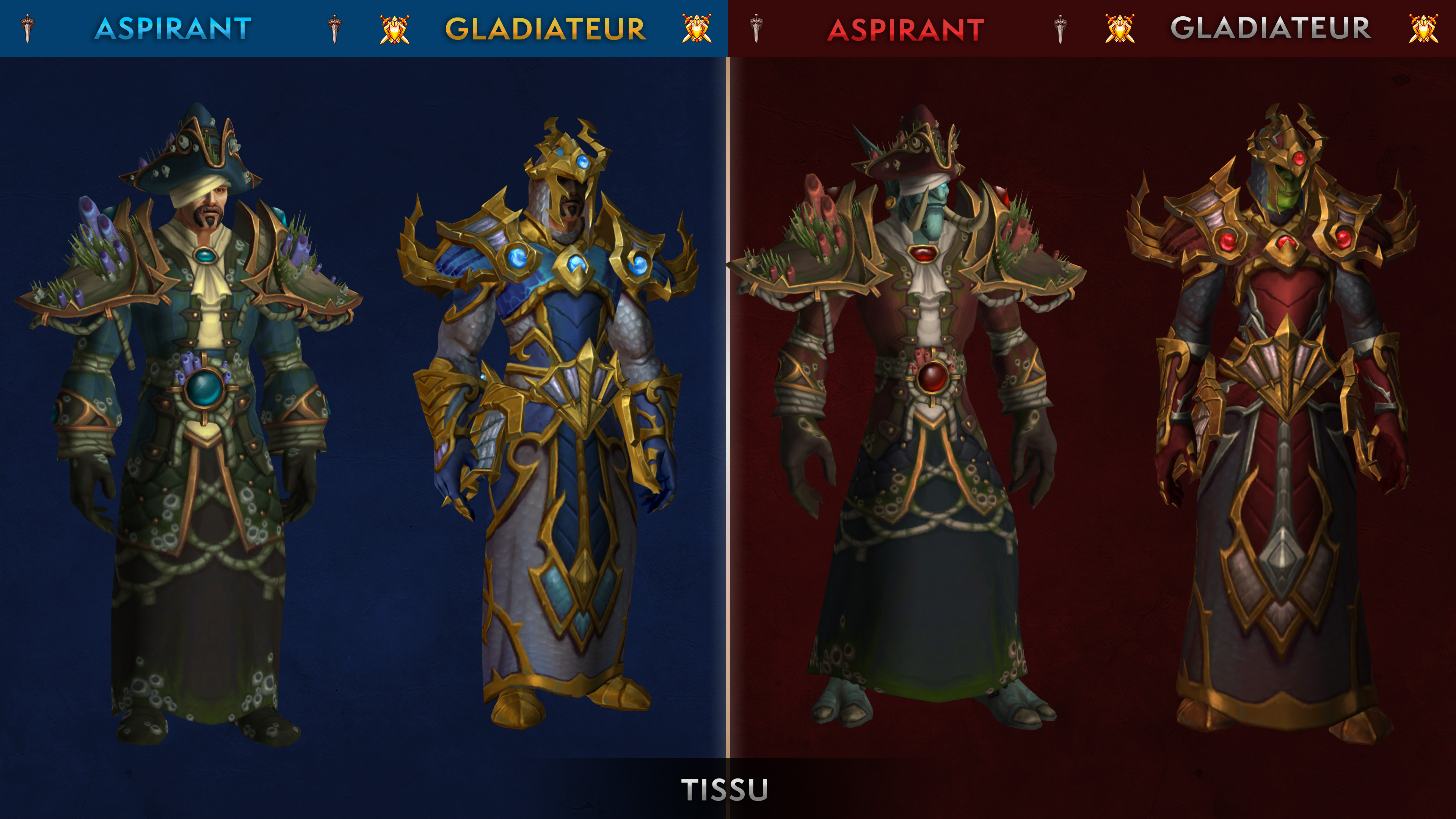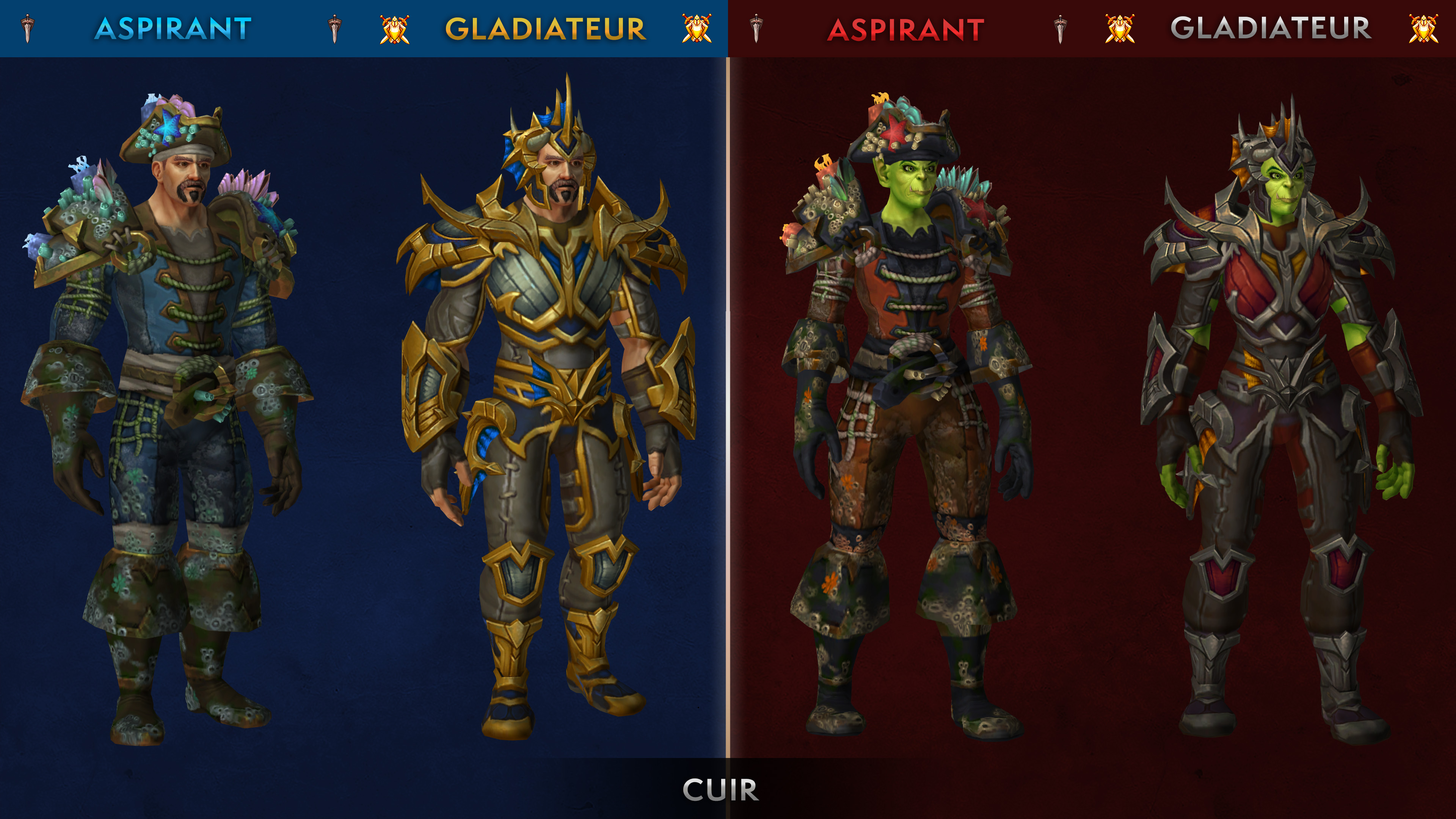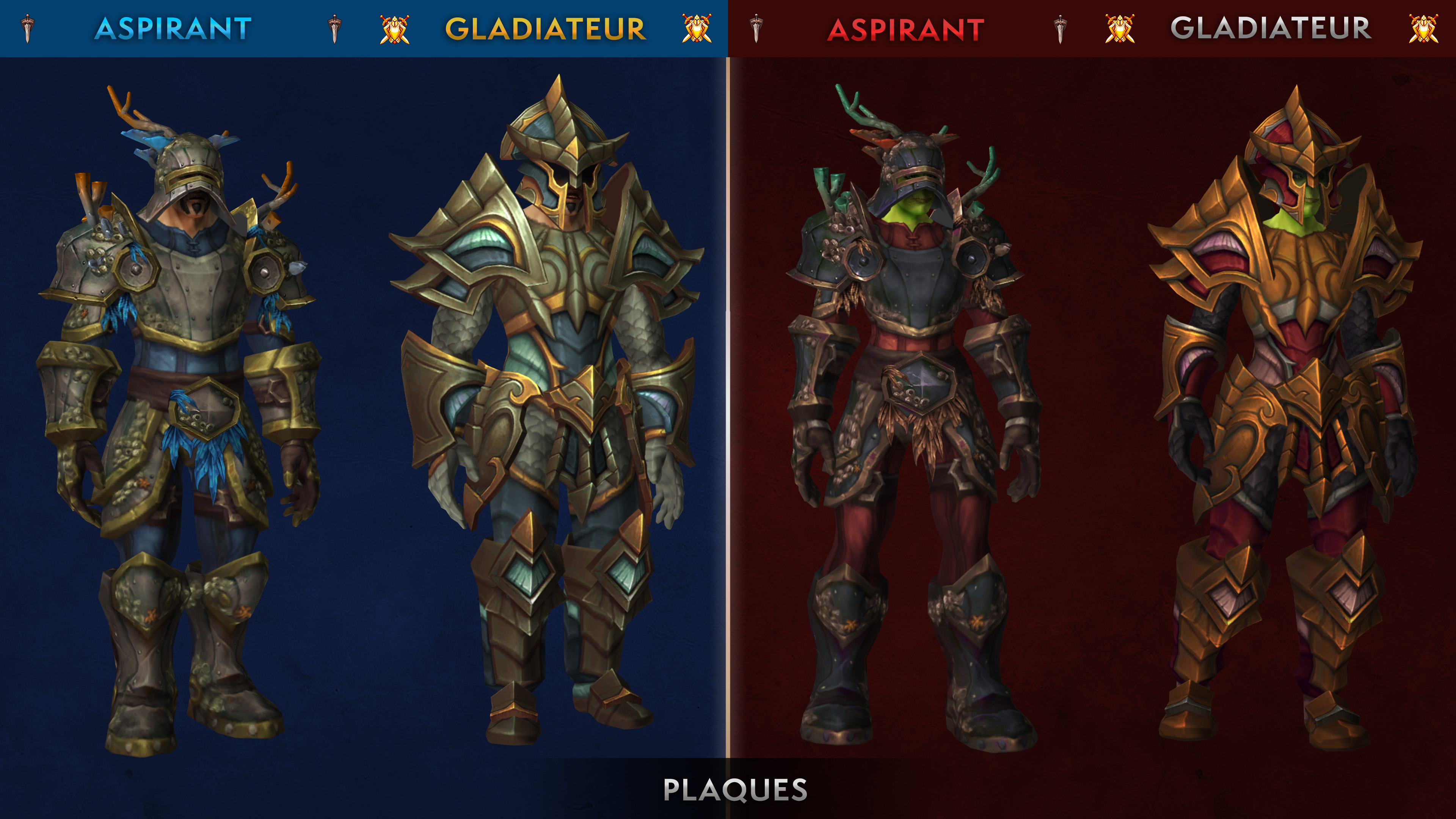 La saison 3 de JcJ de Battle for Azeroth permet de collectionner un ensemble d'armure complet pour les aspirants, gladiateurs ainsi qu'élite pour les joueurs expérimentés dans les combats d'arène et champs de bataille côtés. Cette nouvelle saison, disponible le 10 juillet 2019 en Europe, est l'occasion d'obtenir des pièces d'équipement avec 370 (aspirant) jusqu'à 415 (gladiateur) niveaux d'objets avec une apparence unique. Vous pouvez découvrir l'aperçu de ces nouveaux set d'armure avec les variations de coloris selon l'accessibilité : aspirant, gladiateur et élite pour chaque faction avec un teint bleu pour l'Alliance et un teint rouge pour la Horde. Notez également que les pièces d'équipement benthique de Nazjatar ont un coloris différent de l'ensemble aspirant.