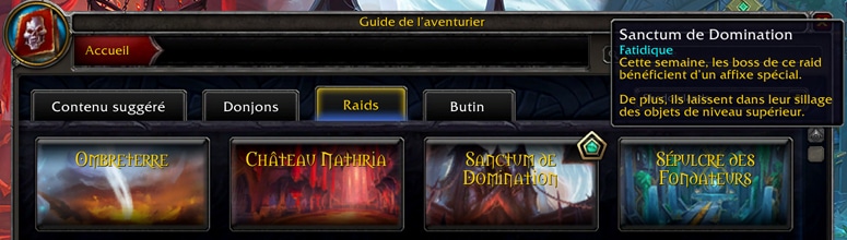 L'interface du guide de l'aventurier propose une nouvelle icône pour afficher le raid actif de la semaine fatidique :