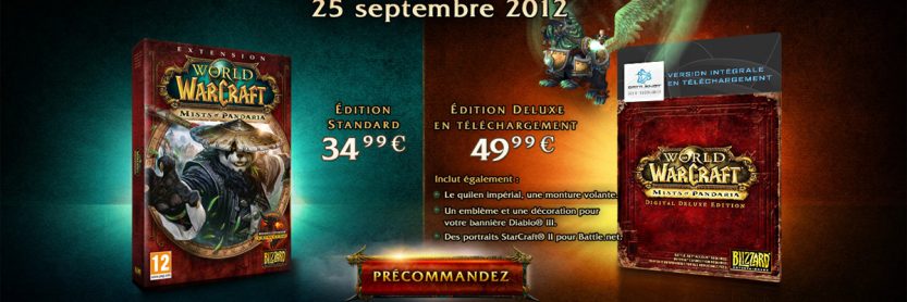 *En précommandant World of Warcraft: Mists of Pandaria, vous pourrez télécharger une version cryptée du jeu avant sa commercialisation. Ce contenu sera débloqué et jouable dès le 25 septembre 2012, jour de sortie de l’extension.