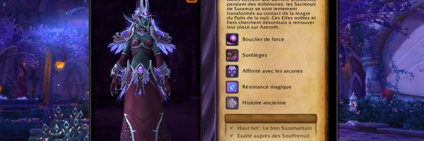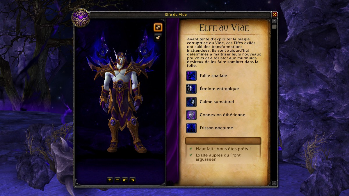 Les ambassades des races alliées à Hurlevent et Orgrimmar vous propose une bannière des races alliées associées à votre faction : Elfe du Vide & Draeneï Sancteforge (Alliance) | Sacrenuit & Tauren de Haut-Roc (Horde). Une fois que vous interagissez avec l'emblème de la faction, vous pouvez ainsi suivre votre progression par une interface qui affiche les traits raciaux ainsi qu'un aperçu visuel et historique. De plus, une partie est également consacrée à indiquer votre avancée dans les pré-requis :