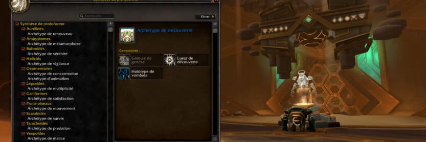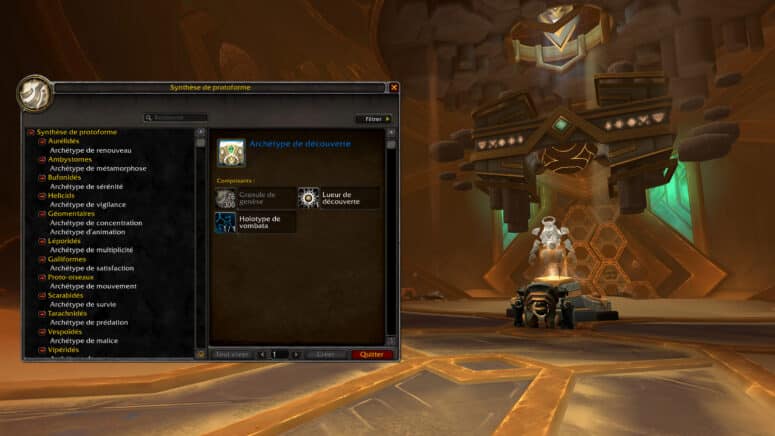 Le royaume de Zereth Mortis de la mise à jour 9.2 de Shadowlands contient une nouvelle fonctionnalité pour fabriquer des mascottes et des montures. La synthèse de protoforme est une console des Fondateurs pour manipuler des nouveaux composants d'artisanat avec les granules de genèse, un holotype et un attribut. Cette fonctionnalité, disponible par la console cryptique, est similaire au fonctionnement du bricoleur de la casse de Mécagone avec une base de données étendue par une réassimilation de schémas récupérés à travers les activités de Zereth Mortis.