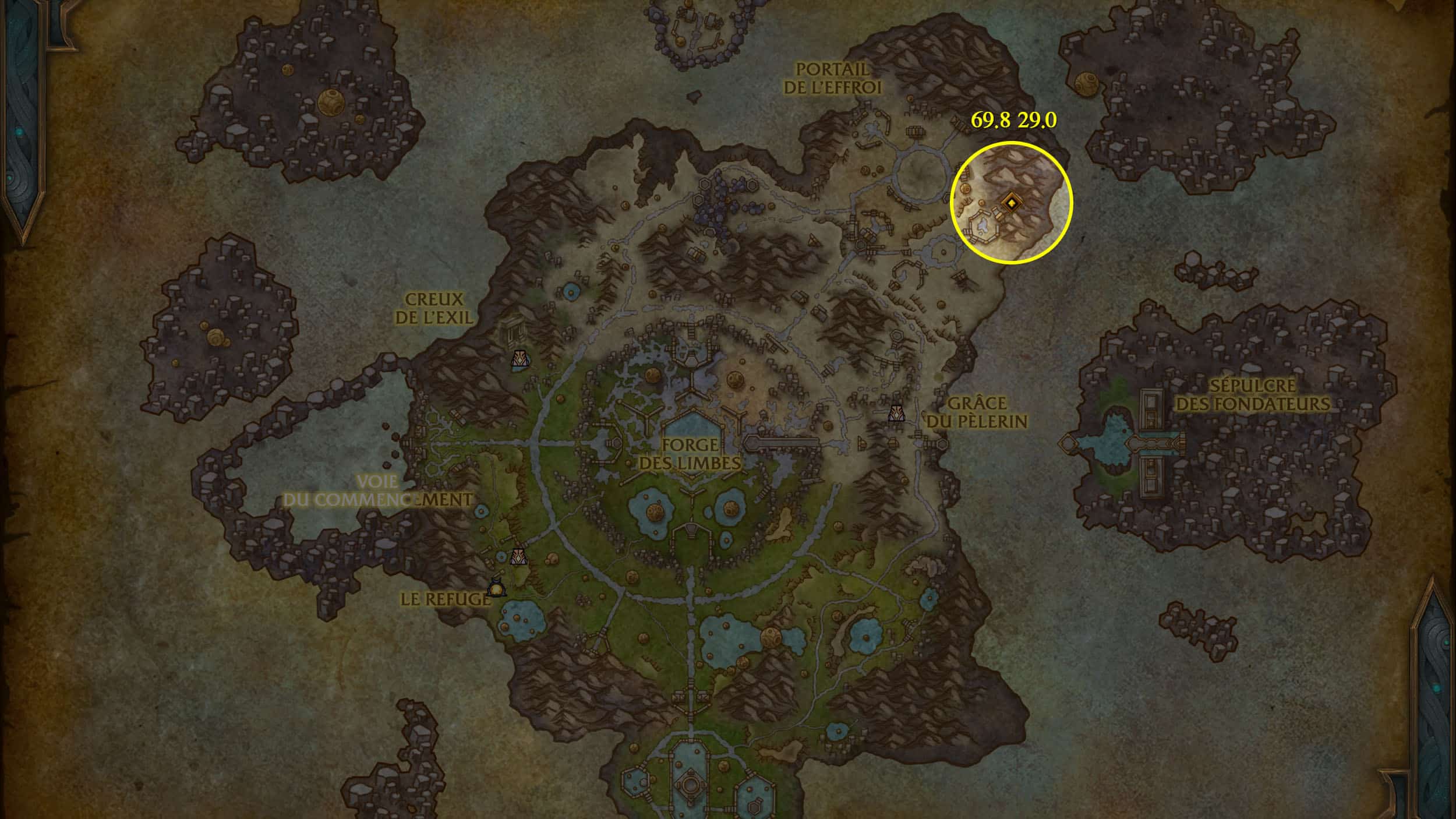 Schéma : Flaire-cristaux curieux : disponible à l'intérieur du raid au sépulcre des Fondateurs dans la deuxième partie de la salle sur Halondrus.