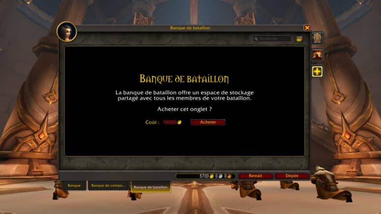 La banque de bataillon contient 5 onglets différents au maximum avec 98 emplacements d'objet chacun, jusqu'à un total de 490 emplacements. La banque de bataillon restera indisponible tant que vous n'avez pas acheté l'onglet 1 contre 1000 pièces d'or pour débloquer la fonctionnalité sur l'ensemble du compte.