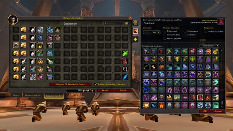 La banque de bataillon s'organise comme un coffre-fort de guilde avec plusieurs options de personnalisation sur les onglets à l’aide d’une icône. Chaque onglet contient les paramètres indispensables pour organiser les objets à l'intérieur de la banque avec tous les emplacements disponibles.