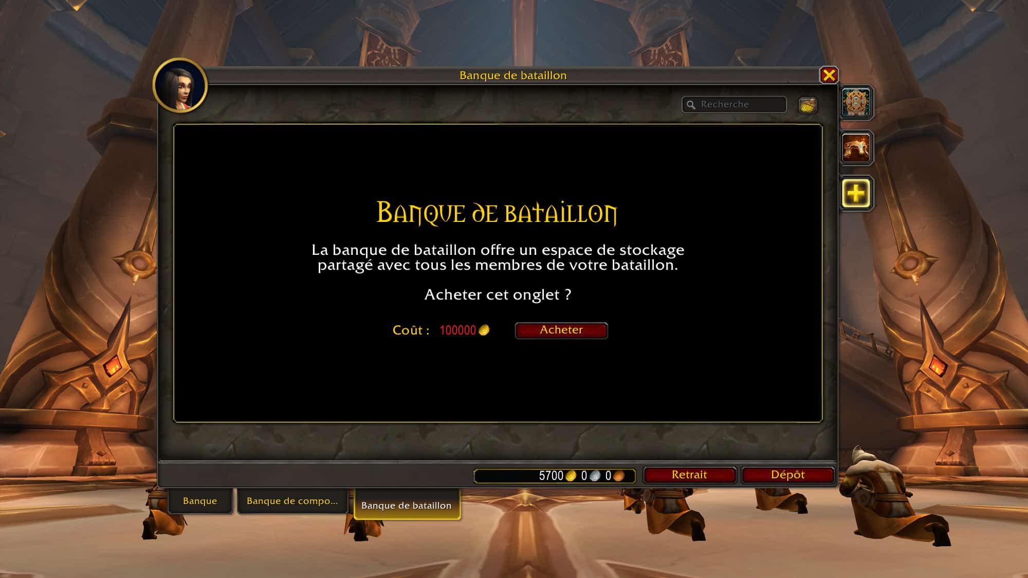 - La banque de bataillon s'organise comme un coffre-fort de guilde avec plusieurs options de personnalisation à chaque onglet.