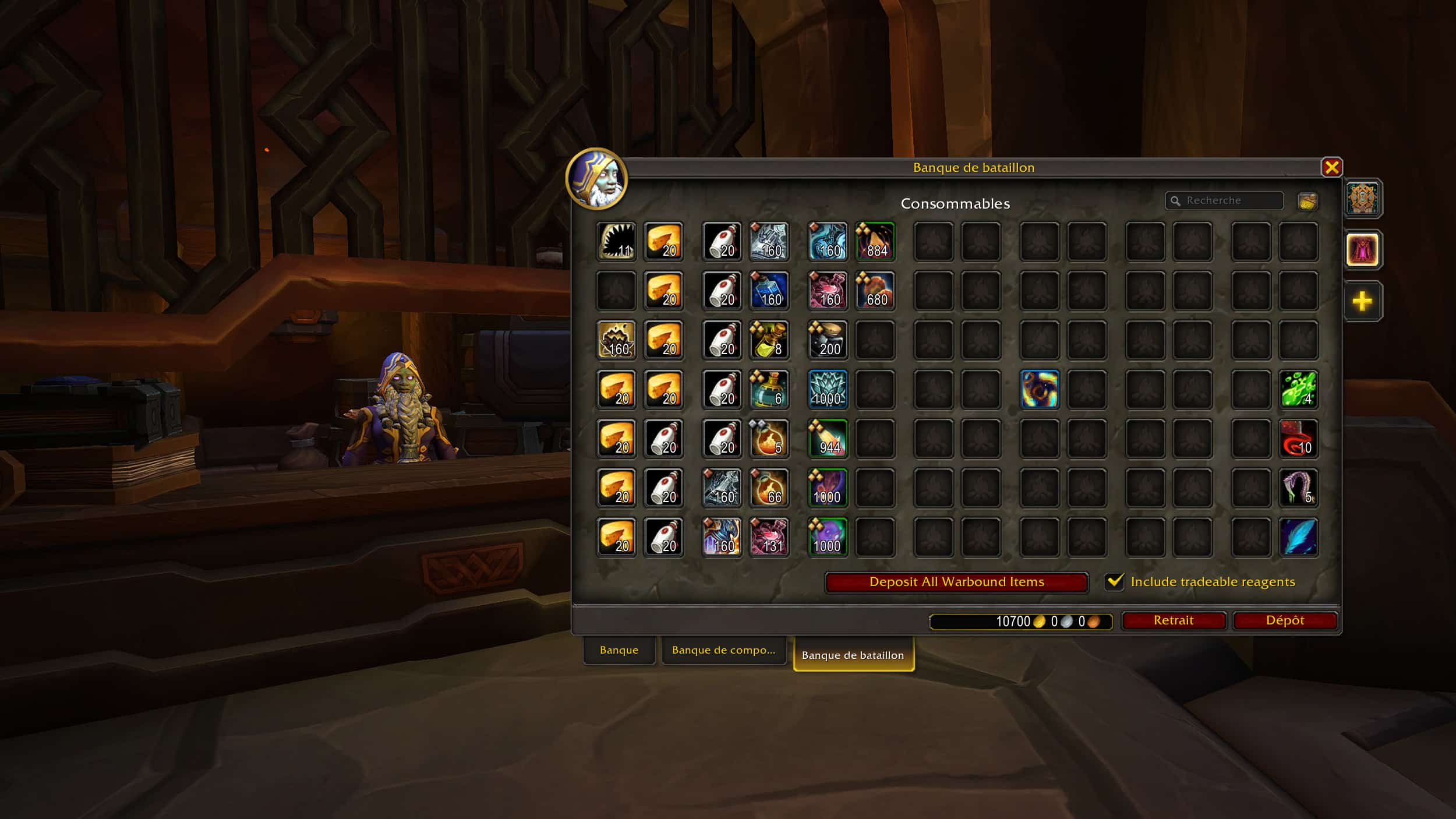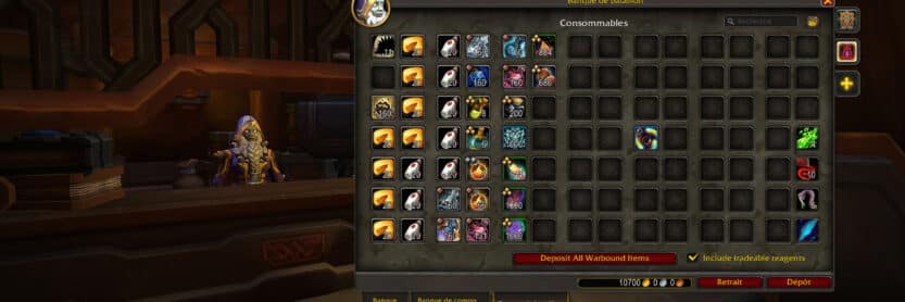 Les banquiers en jeu ont un onglet supplémentaire pour offrir un espace de stockage partagé entre tous les personnages sur le compte. Cet espace de stockage est disponible dès la pré-mise à jour de The War Within pour agrandir l'inventaire avec plusieurs nouveaux emplacements d'objets.