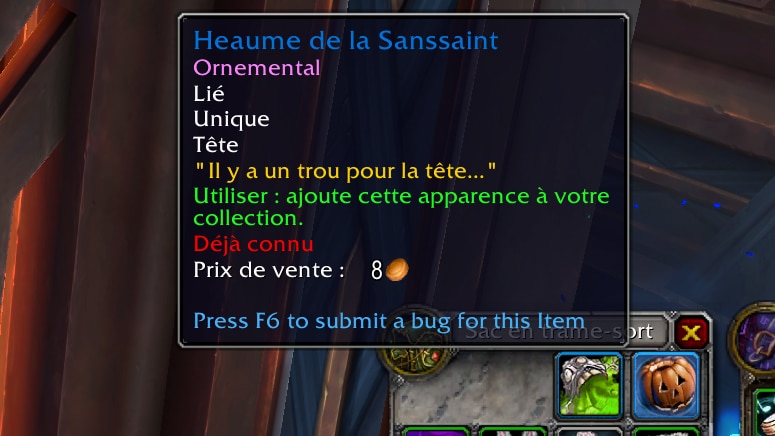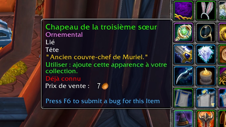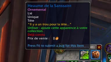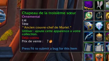 L'apparence de transmogrification des objets avec la mention « Ornemental » a désormais une nouvelle ligne pour ajouter cette apparence à la collection lorsqu'elle est utilisée, au même titre que les mascottes et montures. Une fois que l'objet ornemental a été utilisé, il est instantanément détruit de votre inventaire en contrepartie pour l'apprendre sur le compte.