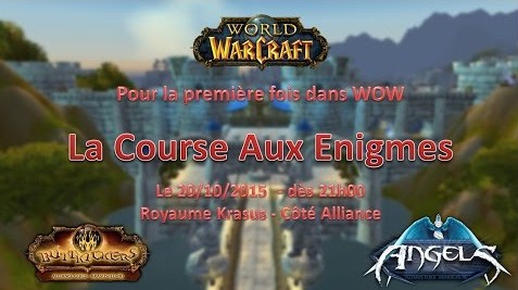 Un événement de grande envergure se prépare sur le serveur Krasus côté Alliance puisque Coupdebambou nous a informé qu'une course aux énigmes est organisé par lui-même de la guilde Buttkickers & Angels, créateurs de divers événements à succès. Cette course aux énigmes permet de remporter des récompenses épiques pour les heureux vainqueurs et cette folle aventure se déroule le Mardi 20 Octobre entre 21h et 21h30 devant la Cathédrale de Hurlevent et préparez-vous à redécouvrir Azeroth. Alors si vous êtes intéressés, contactez Coupdebambou sur Krasus pour valider votre participation et si vous n'aviez pas de personnages, un chevalier de la mort peut contourner ce problème !