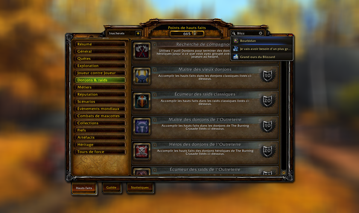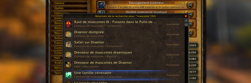 Les hauts-faits ont pris une place importante au cours des années sur World of Warcraft puisqu'on en compte plus de 2500 sur Warlords of Draenor et cette liste va davantage s'allonger avec la sortie de Legion. Ainsi, il est parfois difficile de rechercher son haut-fait dans la section qui correspond, c'est d'ailleurs l'intégration d'un nouveau filtre de recherche pour insérer vos mots-clés et laisser apparaître une liste qui correspond à vos attentes en vous indiquant si celui-ci est achevé ou non. Le filtre qui correspond aux hauts-faits achevés et inachevés prend place à gauche de l'interface.