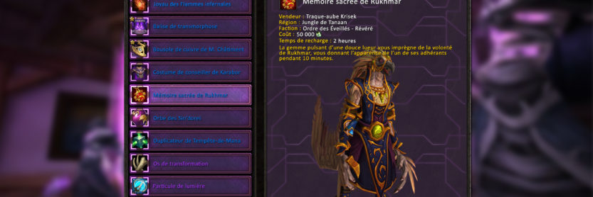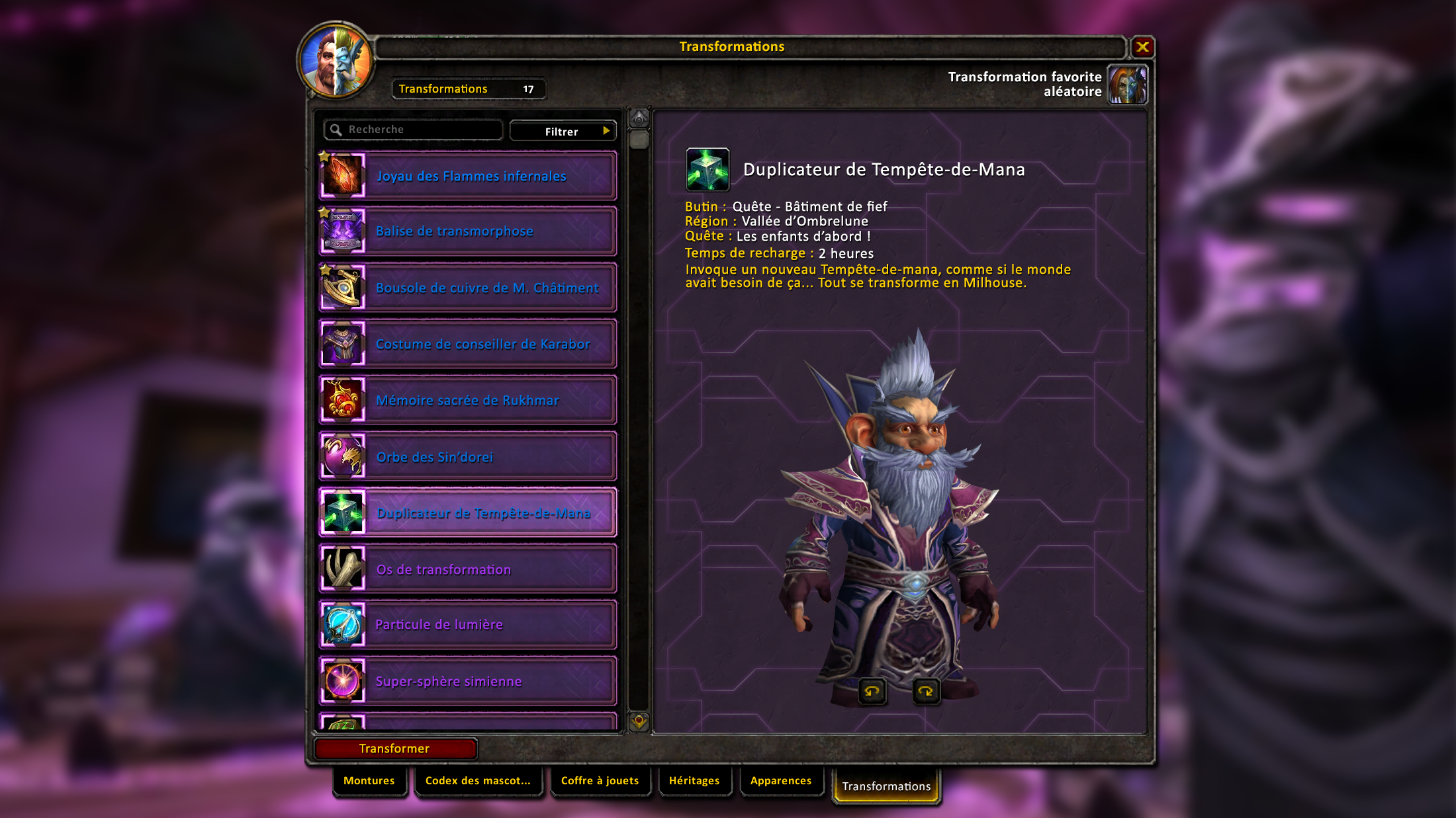 Depuis l'extension Warlords of Draenor, le coffre à jouets est une interface de collection avec pour objectif d'alléger l'inventaire en collectionnant plusieurs objets avec divers effets variés. Au fil du temps et au fur à mesure des mises à jour de contenu déployées, plusieurs nouveaux jouets ont rejoint la collection du coffre à jouet. Cependant, il existe un effet commun parmi ces nombreux effets variés avec les transformations. Dans une prochaine mise à jour de contenu, ce mot clé « Transformation » devient un onglet supplémentaire dans la collection avec les transformations du personnage par des jouets convertis dans cette interface supplémentaire. Les transformations modifient l'apparence du personnage comme l'orbe de Sin'dorei, la balise de transmorphose ou même le duplicateur Tempête-de-mana. Vous pouvez ainsi retrouver notre aperçu dédié à cette interface de transformations.