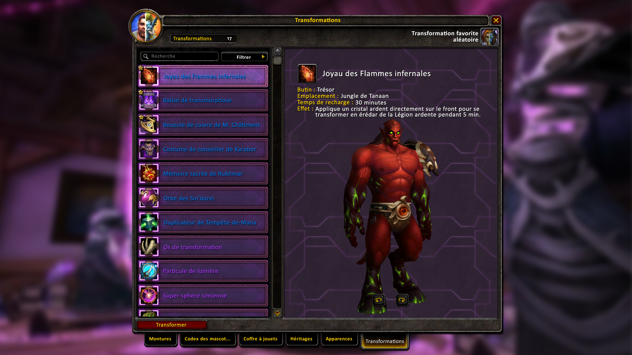 Pour mieux identifier que l'objet récupéré est une nouvelle transformation à collectionner, un nouveau mot clé « Transformation » en violet pâle est disponible. Les anciens objets qui utilisaient la catégorie « Jouet » seront transformés automatiquement au déploiement de la prochaine mise à jour pour différencier ces deux types d'objets pour la collection. D'ailleurs, à ce propos, la nouvelle balise de transmorphose dans la boutique de Blizzard sera l'unique exception puisque cet objet est considéré comme un jouet et une transformation en même temps pour ne pas tomber dans de la publicité mensongère.